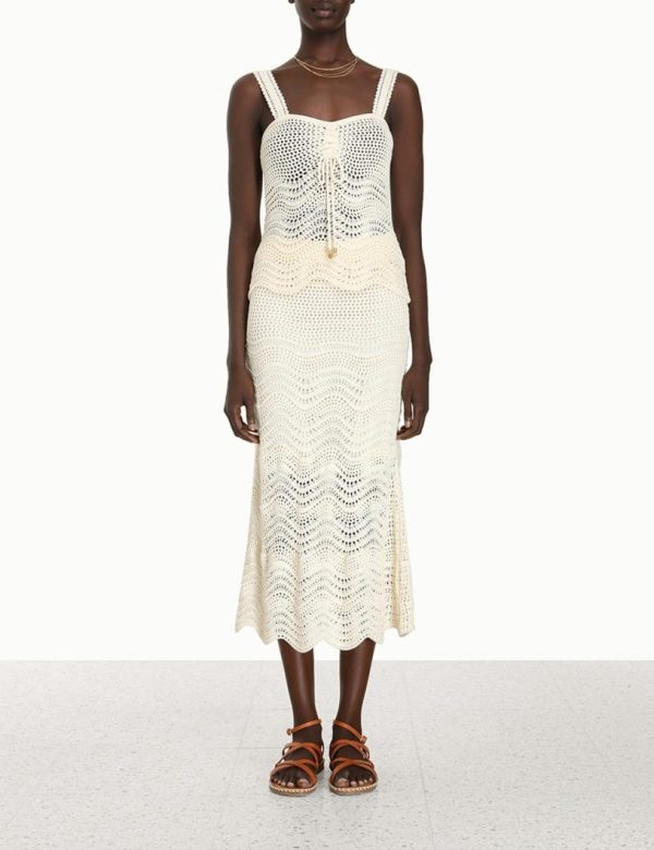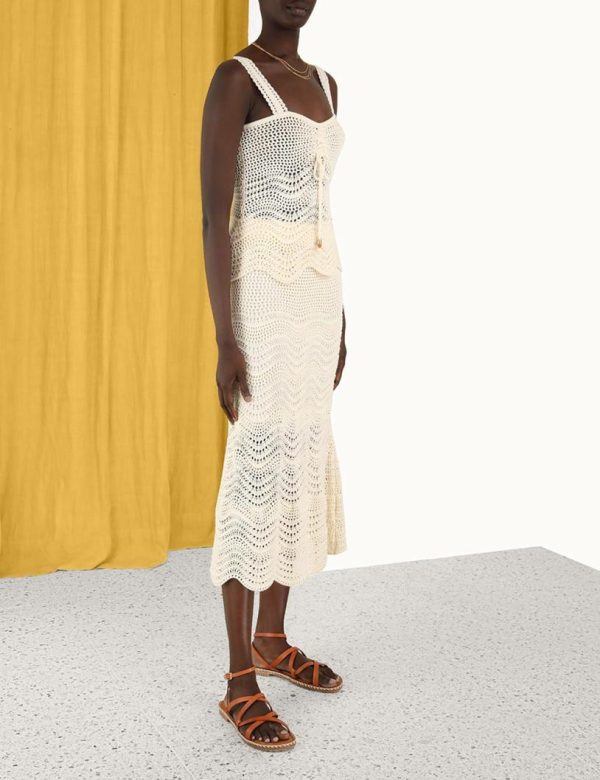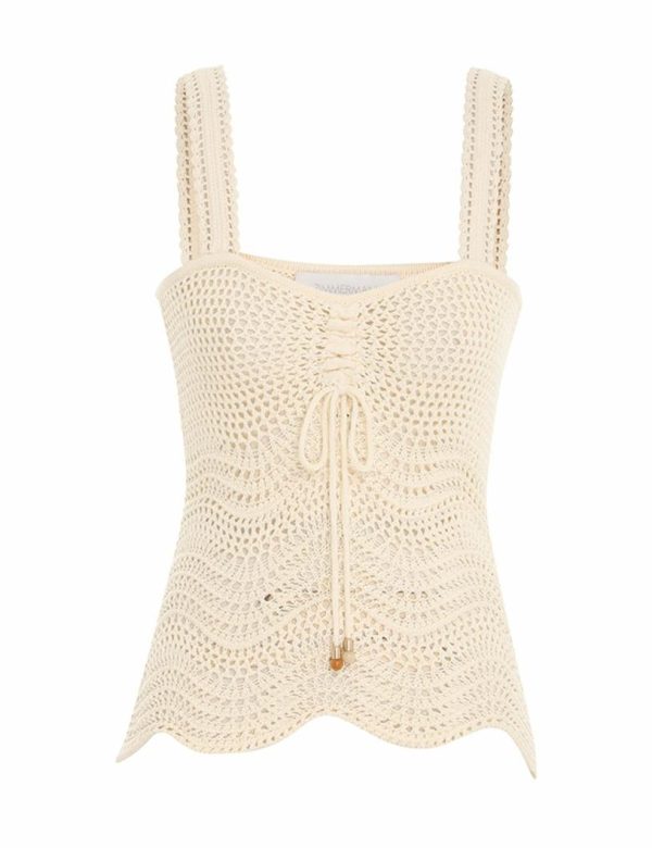 The Devi Textured Knit Tank in Cream from our Summer Swim 2023 Collection. A knitted tank top featuring a lace up yoke and scalloped texture throughout.