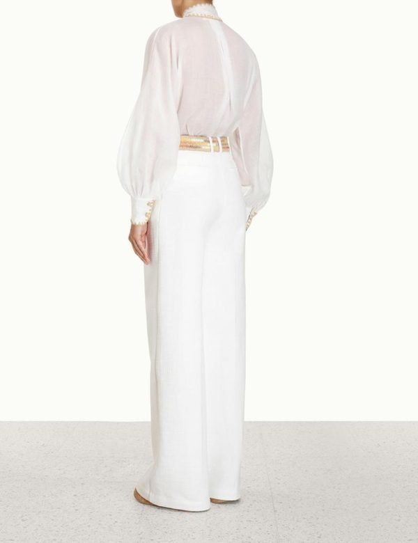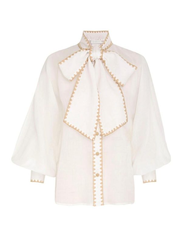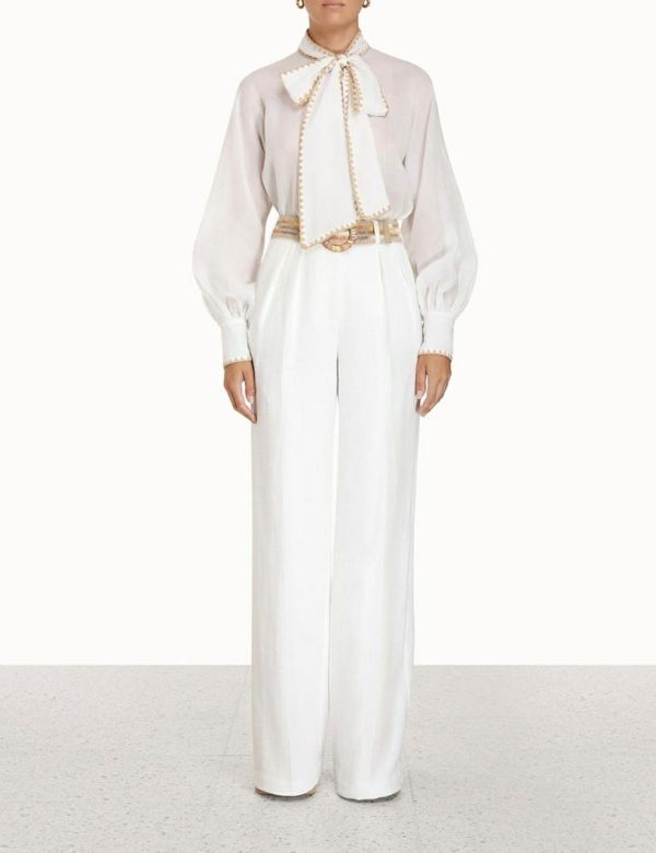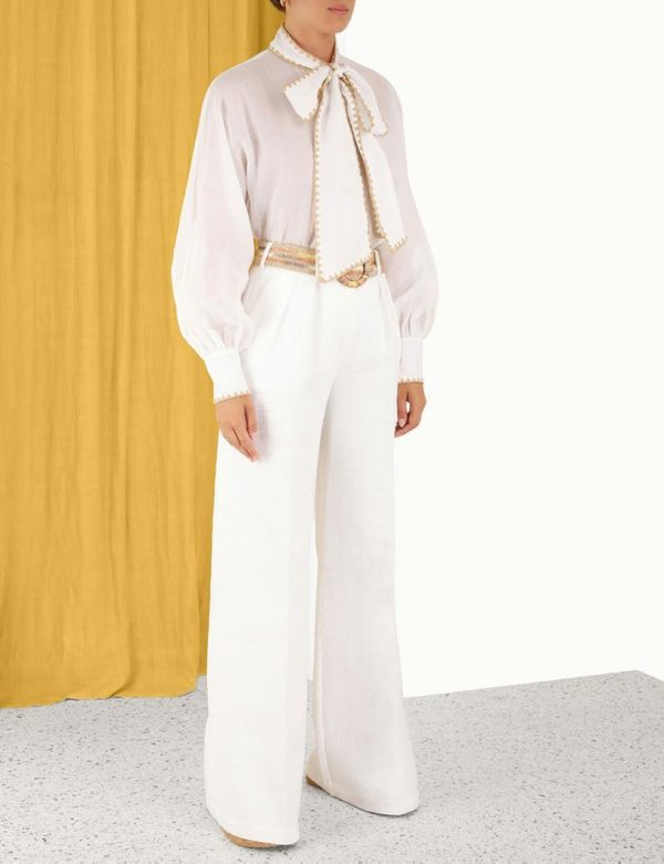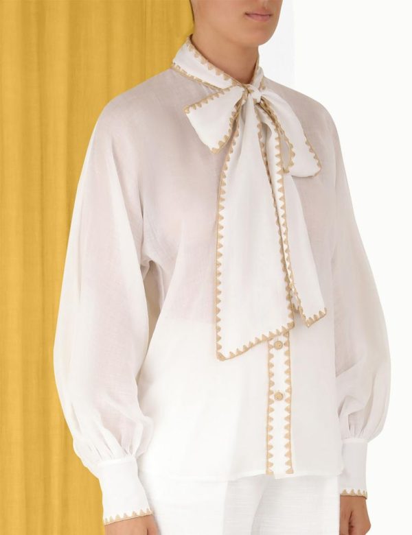 The Devi Tie Neck Blouse in Ivory from our Summer Swim 2023 Collection. A ramie long sleeve blouse with a neck tie, box pleating, and buttons down the centre front.