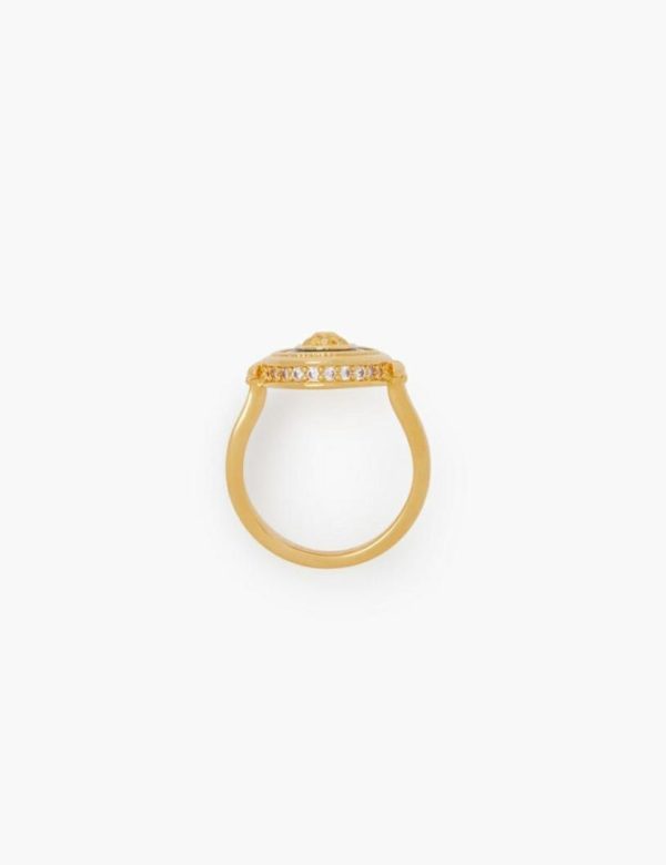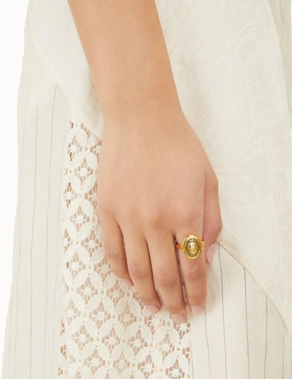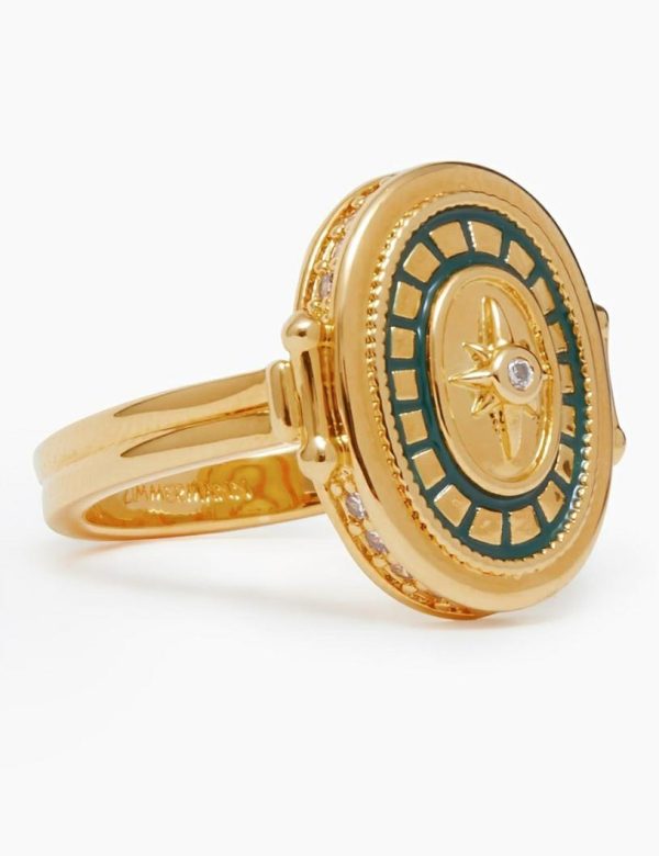 The Enamel Signet Ring in Gold/Green from our Fall 2023 Collection, Luminosity. A gold plated ring featuring contrast enamel and cubic zirconia stones throughout.
