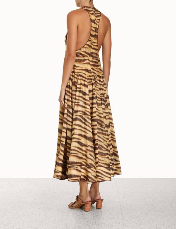 The Ginger Drop Waist Midi Dress in Tiger from our Summer Swim 2023 Collection. A silk midi dress featuring a drop waist and contrast piped edges.