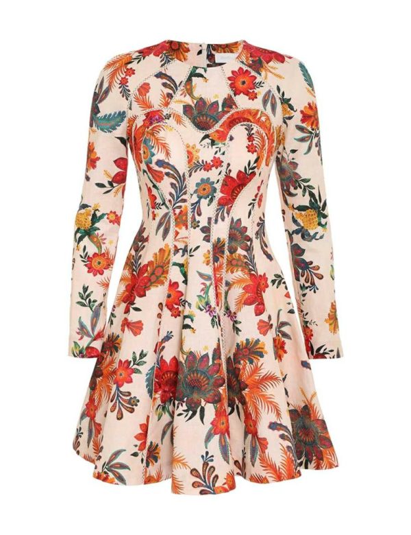 The Ginger Fit & Flare Mini Dress in Ivory Floral from our Summer Swim 2023 Collection. A linen mini dress featuring long sleeves and crochet insert trims throughout.
