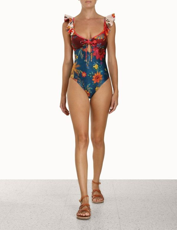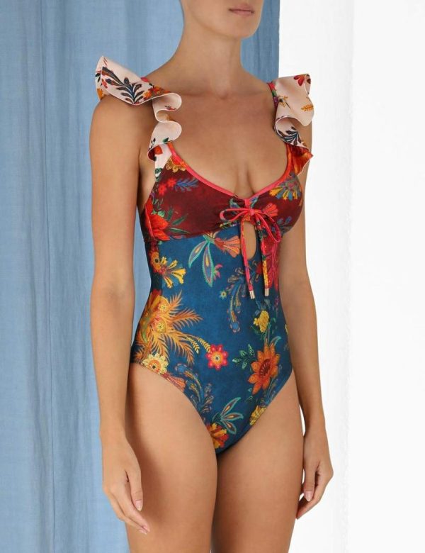 The Ginger Frill Shoulder 1PC in Spliced from our Summer Swim 2023 Collection. An Italian lycra one piece featuring a frilled shoulders and tie front bust.