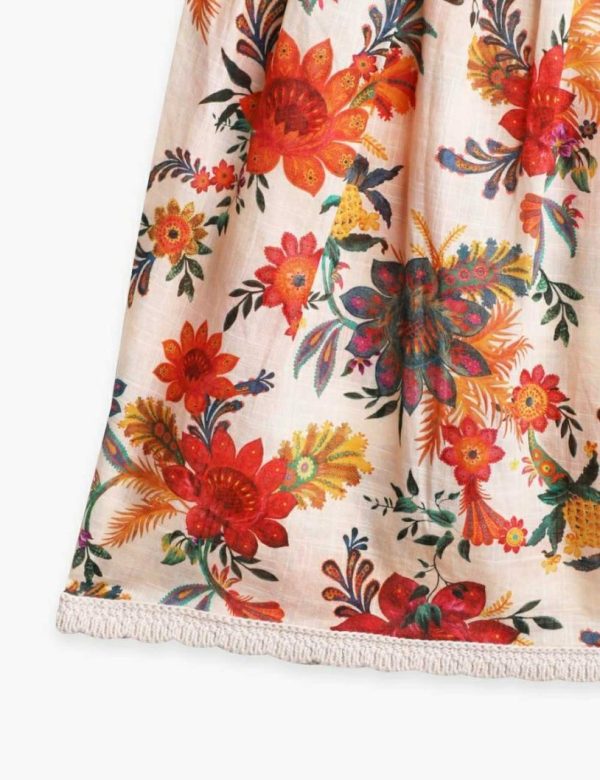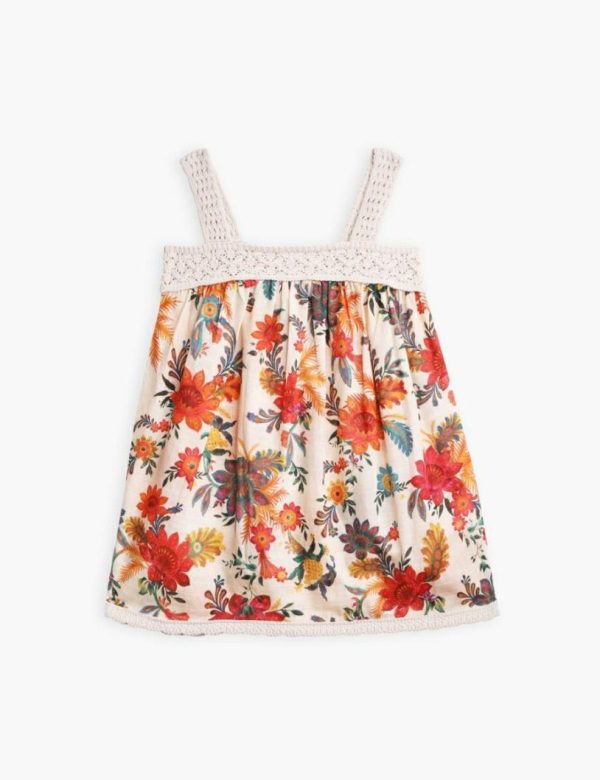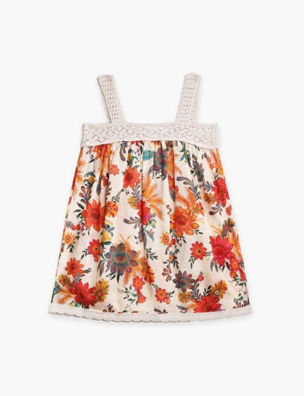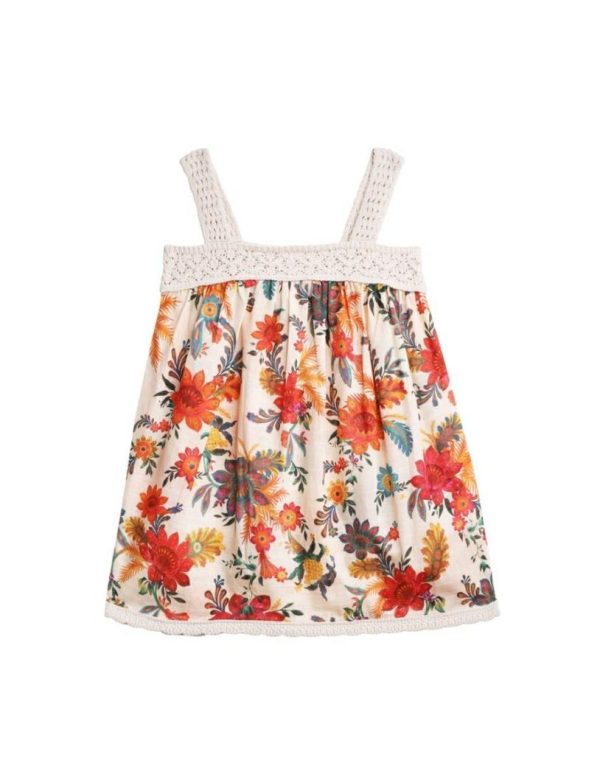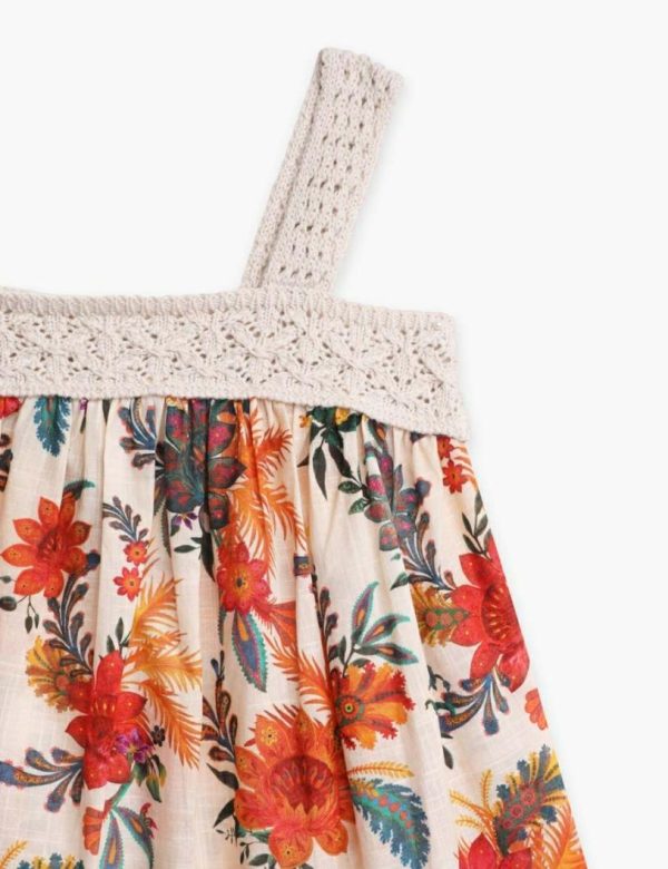 The Ginger Knit Trim Dress in Ivory Floral from our Summer Swim 2023 Collection. A mini dress featuring a crochet bodice and crochet contrast trims, finished with a placement print through the skirt.