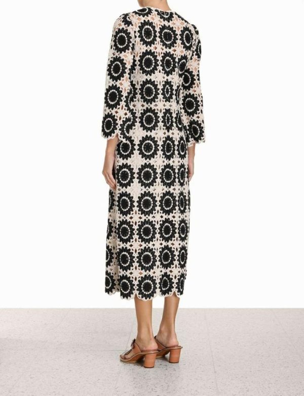 The Ginger Lace Midi Dress in Cream/Black from our Summer Swim 2023 Collection. A lace midi dress featuring a scalloped hem and sleeve, an invisible zip at the centre back and gathering at the sleeve head.