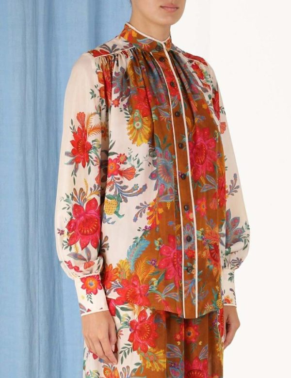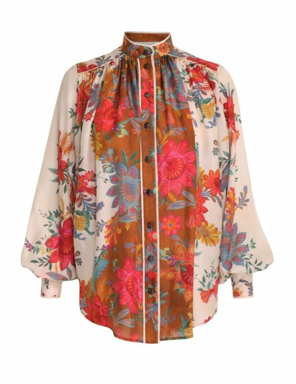 The Ginger Relaxed Blouse in Cream/Brown Floral from our Summer Swim 2023 Collection. A silk blouse featuring cowl batwing sleeves and contrast piping throughout.