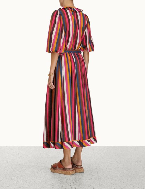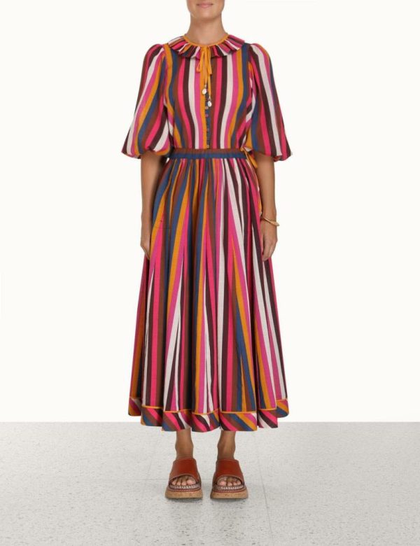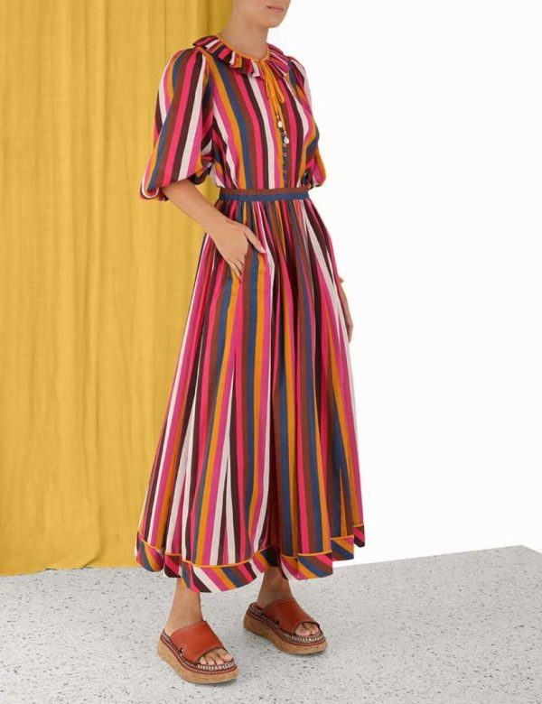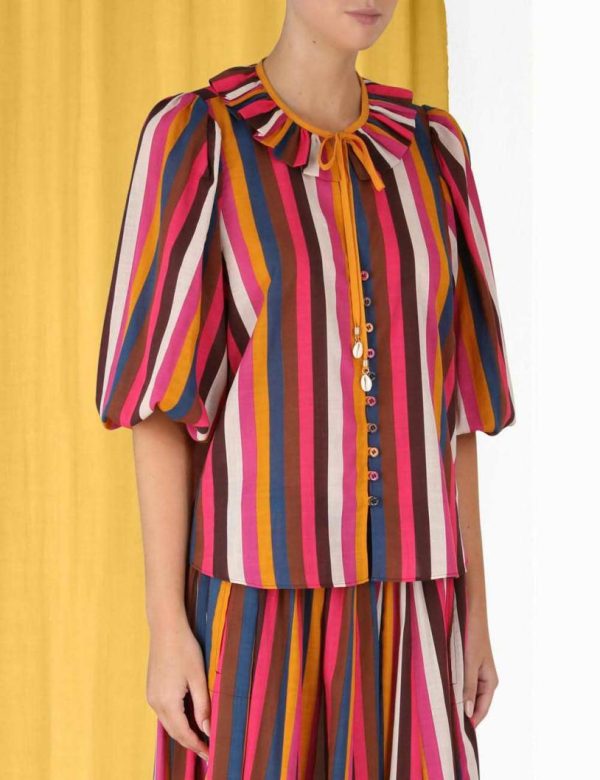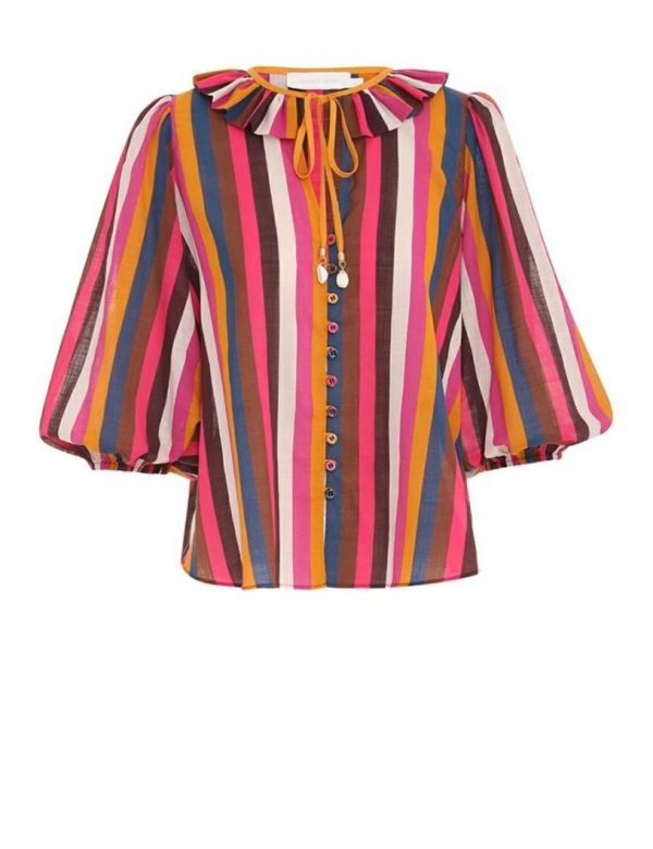 The Ginger Ruffle Neck Top in Multi Stripe from our Summer Swim 2023 Collection. A cotton top featuring blouson sleeves and a ruffled neckline.