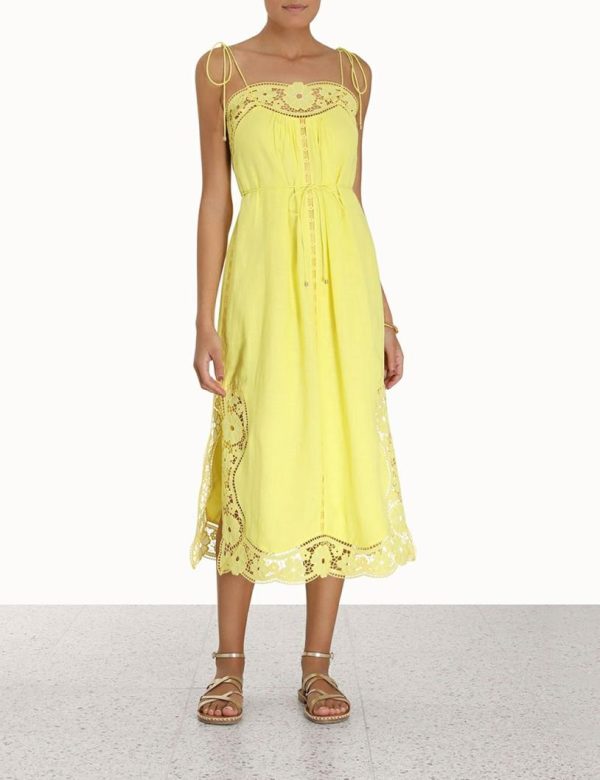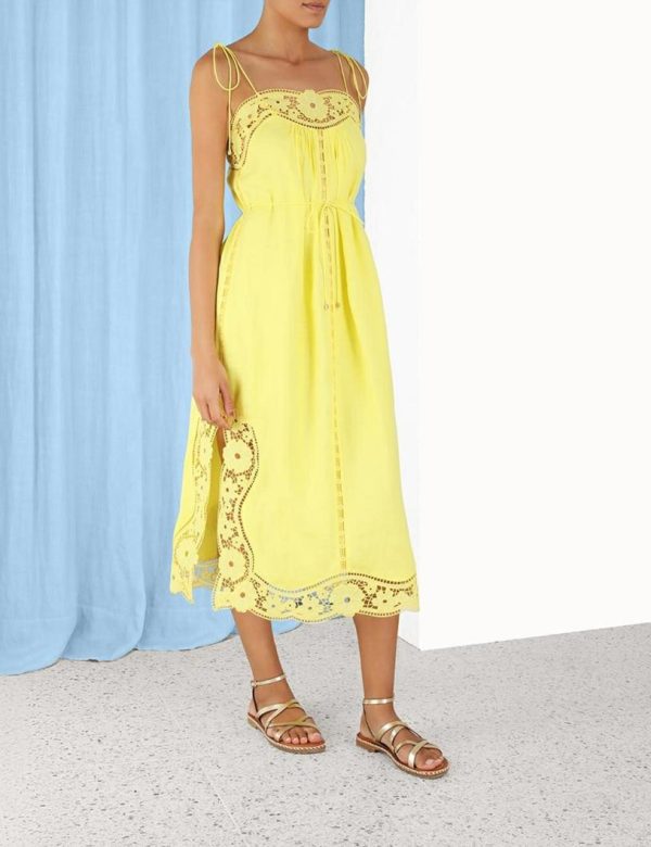 The Halcyon Broderie Slip Dress in Yellow from our Summer Swim 2023 Collection. A linen slip dress featuring self tie rouleau straps and panels of broderie lace throughout.