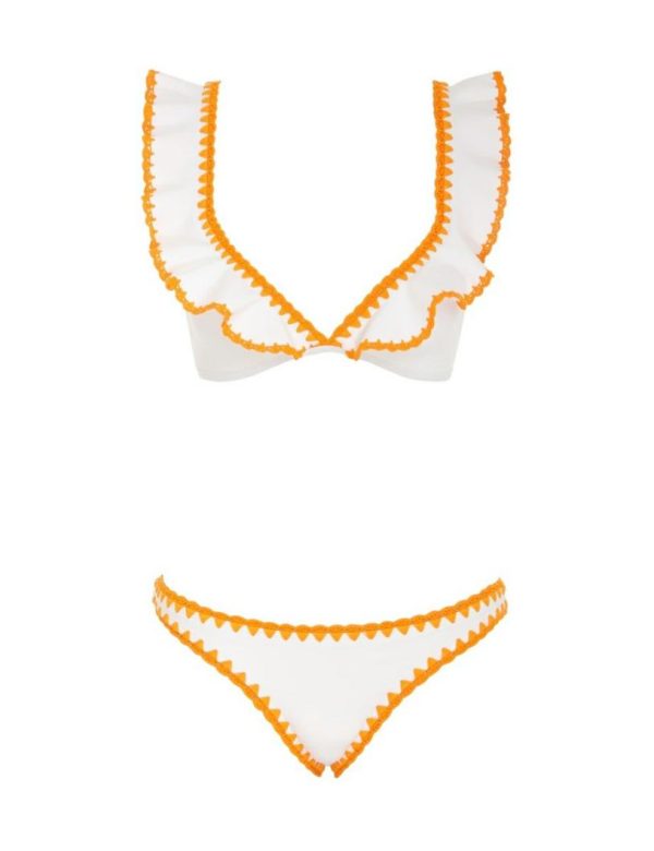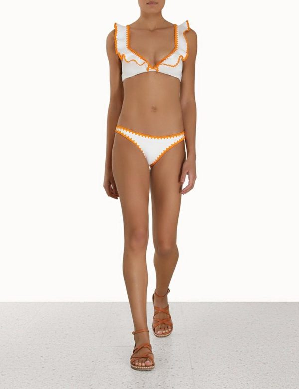 The Halcyon Crochet Frill Bikini in Ivory/Tangerine from our Summer Swim 2023 Collection. A triangle crochet bikini top featuring self bonded frills and crochet edge pant.