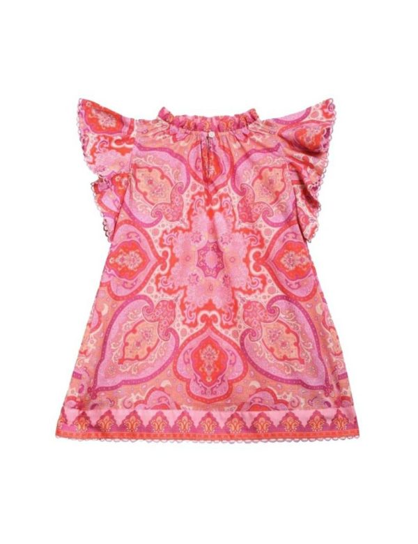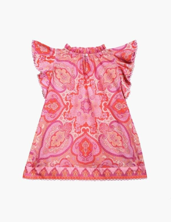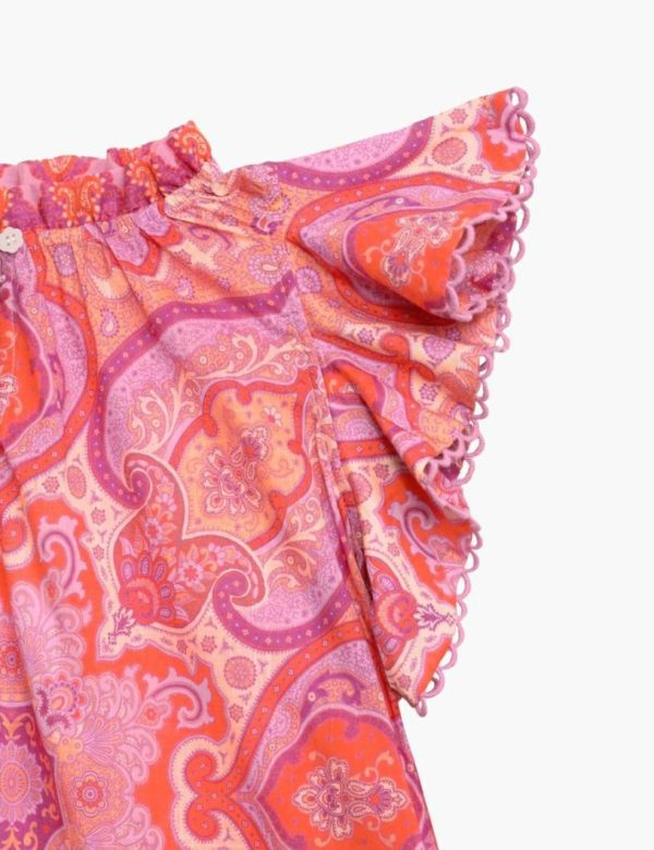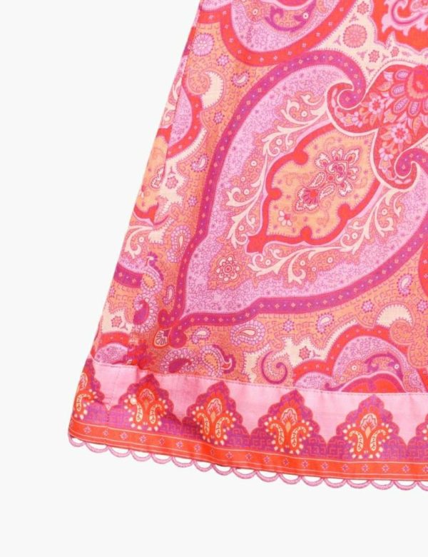 The Halcyon Flounce Sleeve Dress in Pink/Purple Paisley from our Summer Swim 2023 Collection. A cotton dress featuring frills throughout.
