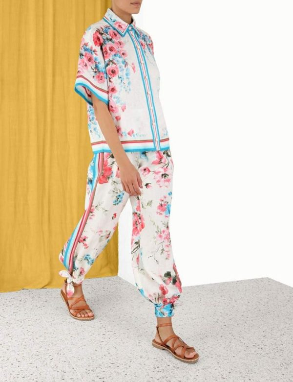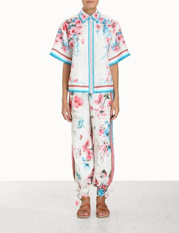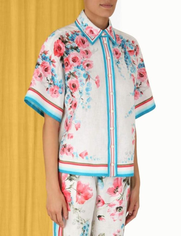 The Halcyon Oversized Shirt in Pink/Blue Floral from our Summer Swim 2023 Collection. A linen shirt featuring an oversized silhouette with classic shirt shaping and a placement print throughout.