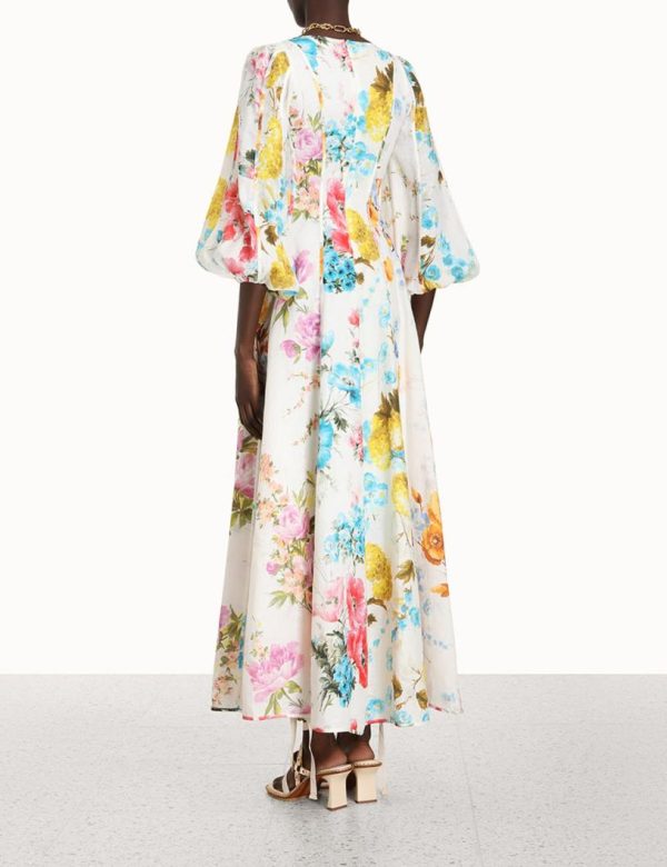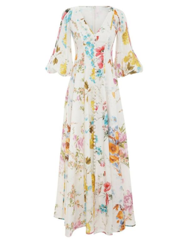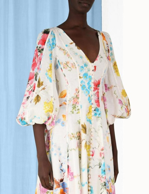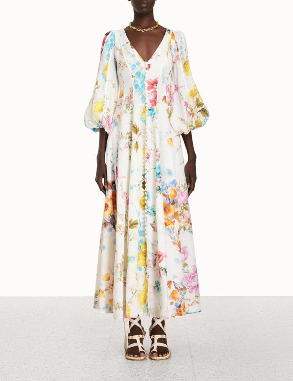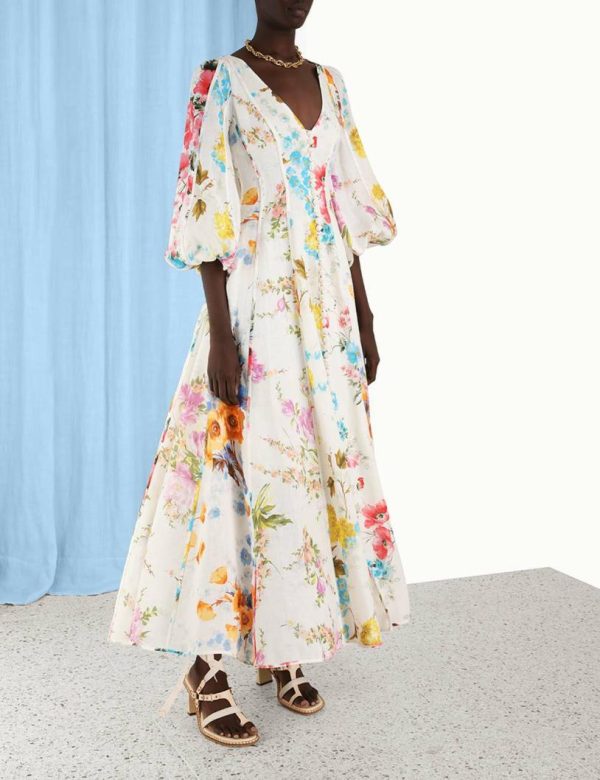 The Halcyon Panelled Maxi Dress in Spliced from our Summer Swim 2023 Collection. A linen maxi dress featuring exaggerated sleeves and buttons down the centre front.