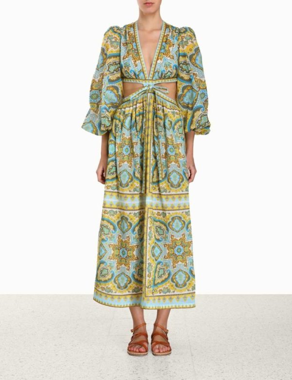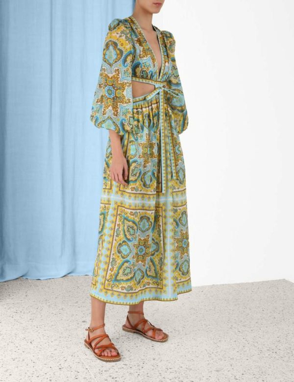 The Halcyon Tie Front Midi Dress in Blue Yellow Paisley from our Summer Swim 2023 Collection. A cotton voile midi dress featuring a plunging V-neckline, finished with a cutaway waist and back.