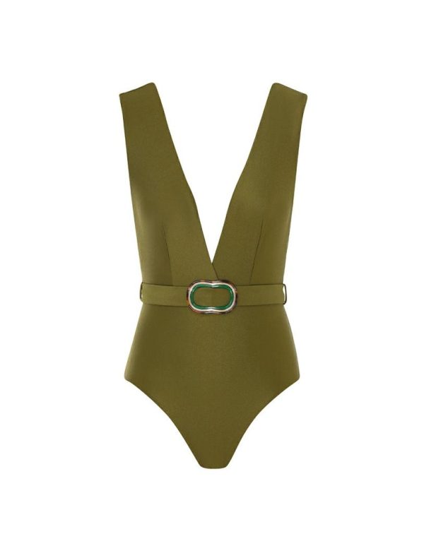 The Junie Belted Plunge 1PC in Olive from our Resort Swim 2024 Collection. A lycra plunging one piece featuring belt loops and a removable belt.