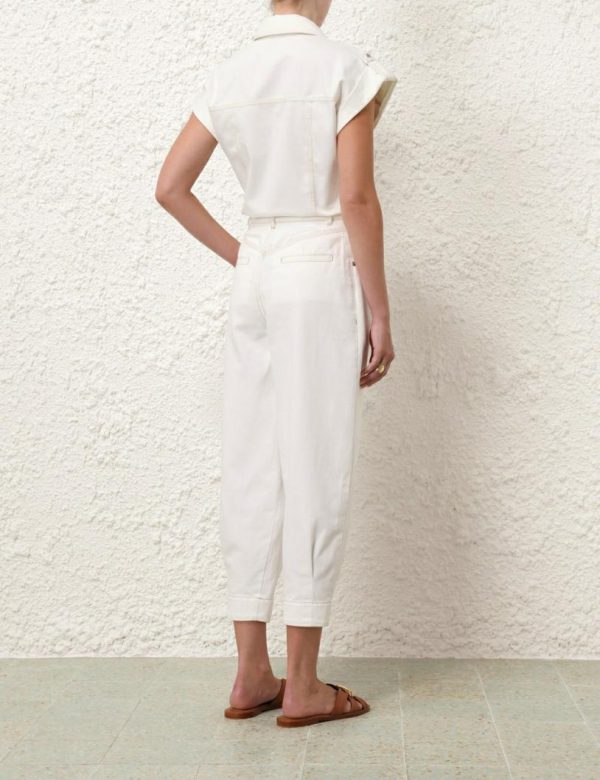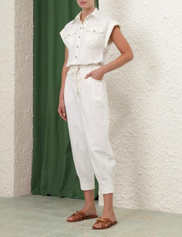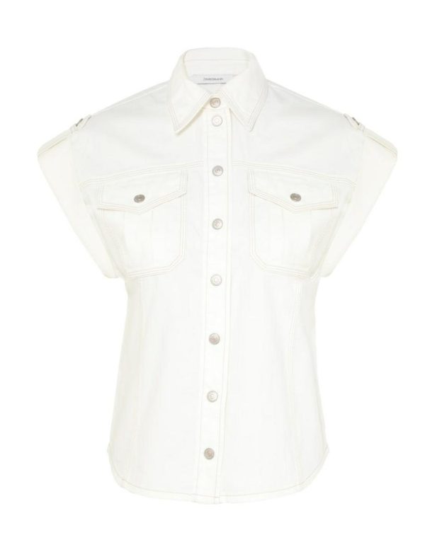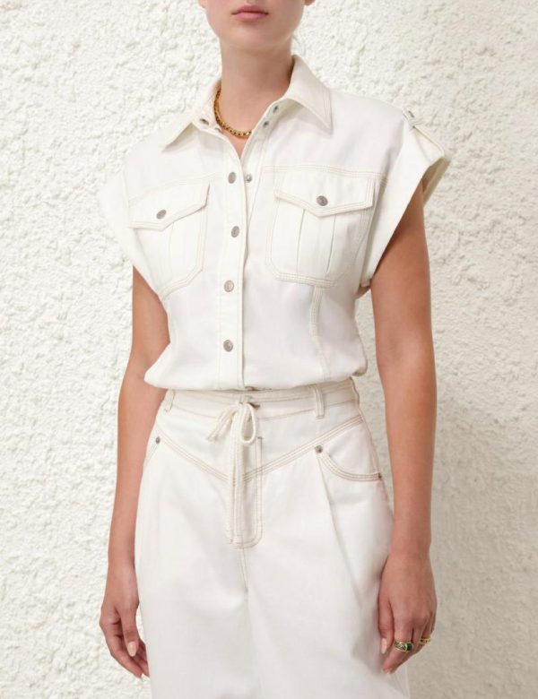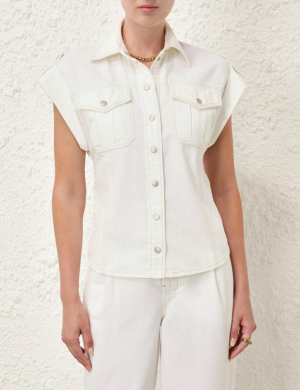 The Junie Denim Utility Shirt in Vintage White from our Resort Swim 2024 Collection. A vintage white denim shirt in a utility style silhouette.