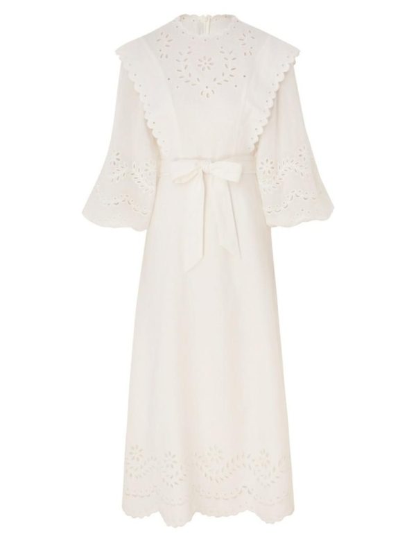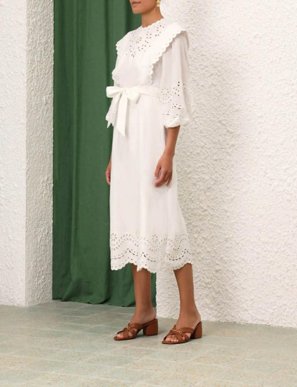 The Junie Embroidered Midi Dress in Ivory from our Resort Swim 2024 Collection. A linen midi dress featuring placement scalloped embroidery, elasticated sleeve cuffs and a removable waist tie.