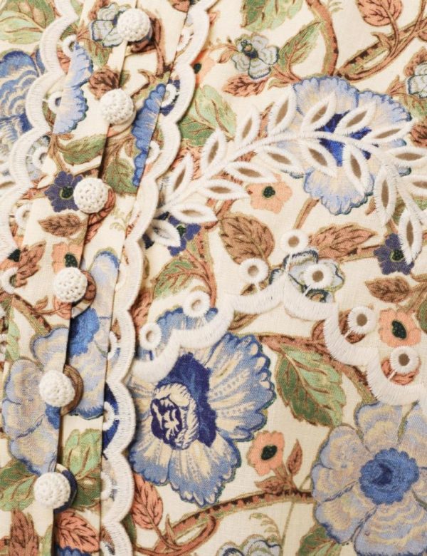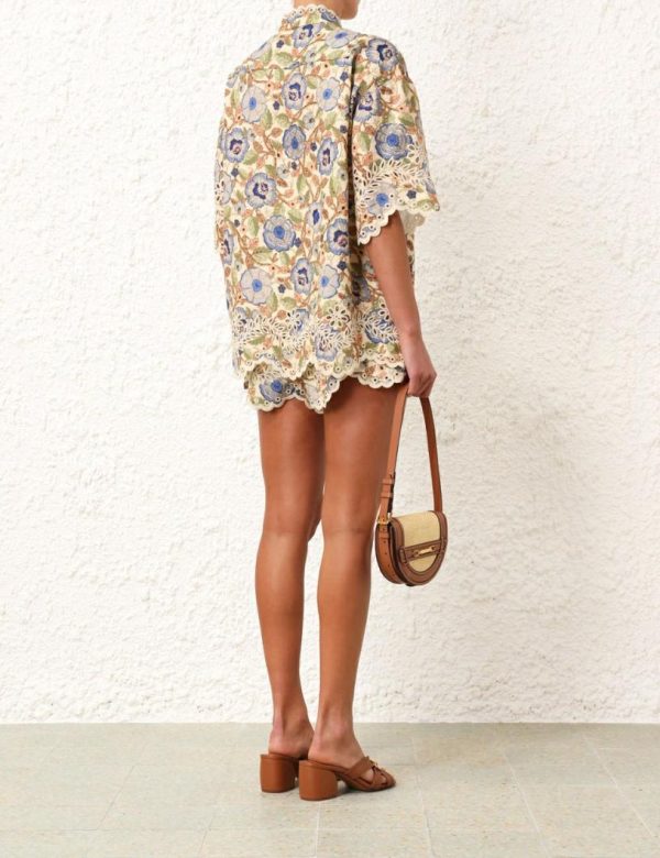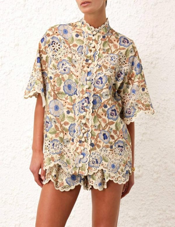 The Junie Embroidered Shirt in Ivory/Blue Floral from our Resort Swim 2024 Collection. A cotton short sleeve shirt featuring placement embroidery.
