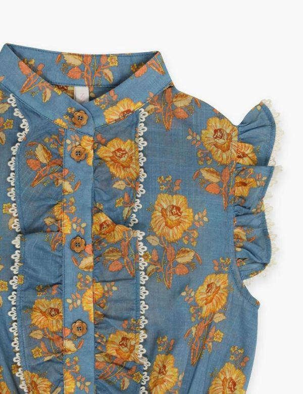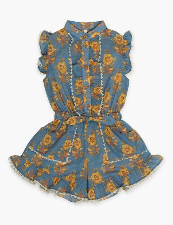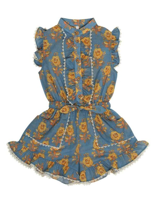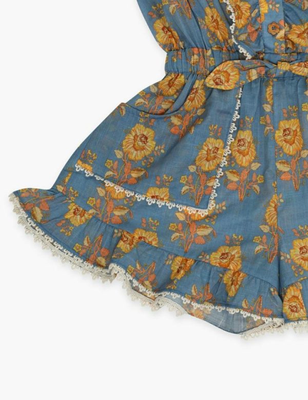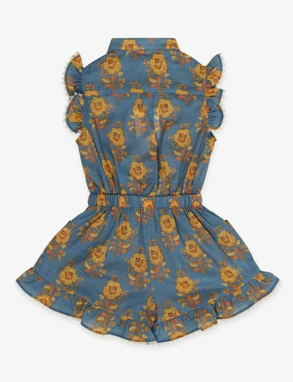 The Junie Frill Playsuit in Blue/Yellow Floral from our Resort Swim 2024 Collection. A cotton playsuit featuring a drawstring waist, frilled sleeves and hems and scalloped edging throughout.