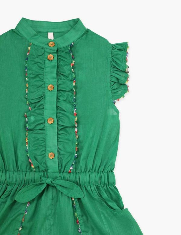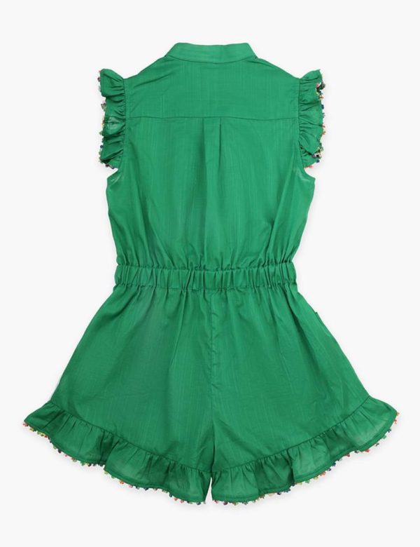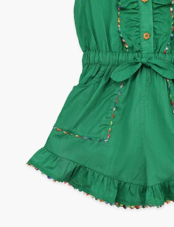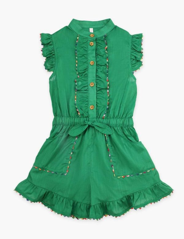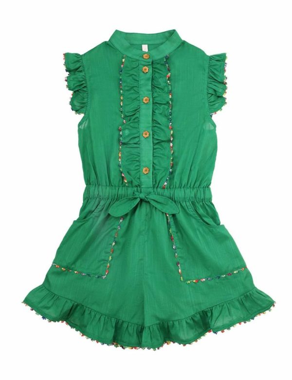 The Junie Frill Playsuit in Green from our Resort Swim 2024 Collection. A cotton playsuit featuring a drawstring waist, frilled sleeves and hems and scalloped edging throughout.