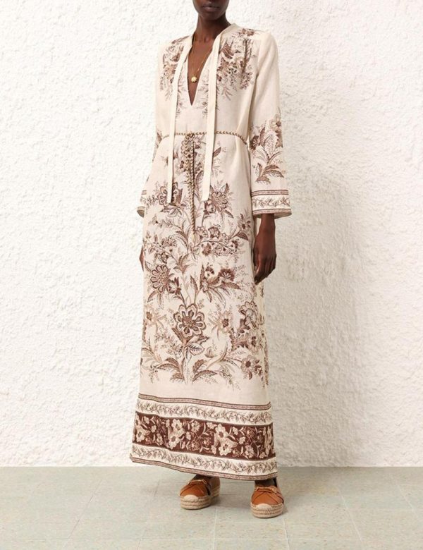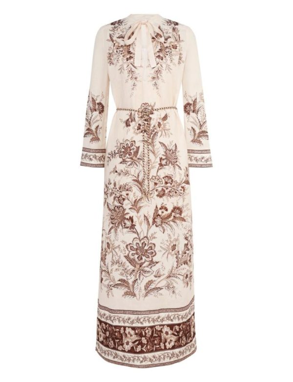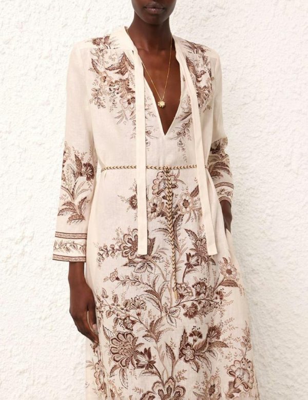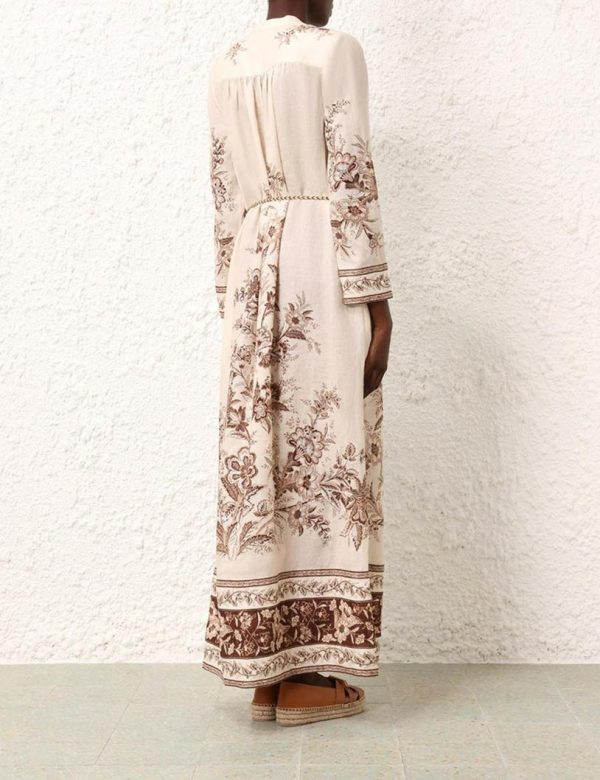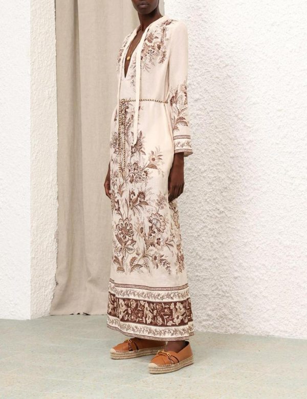 The Junie Long Sleeve Maxi Dress in Beige Floral from our Resort Swim 2024 Collection. A linen maxi dress featuring side pockets and a removable belt.