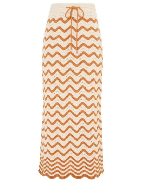 The Junie Textured Knit Skirt in Tan/Cream from our Resort Swim 2024 Collection. A knitted midi skirt featuring a contrast wavy stripe.