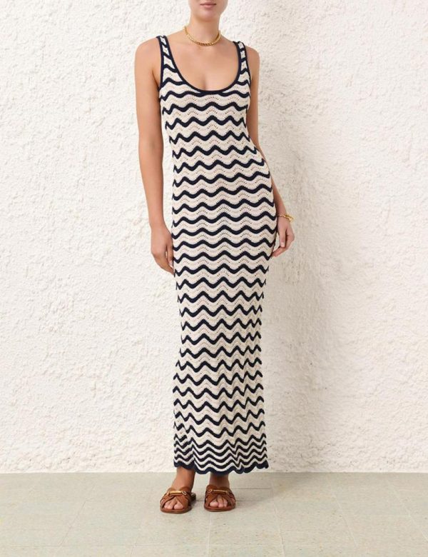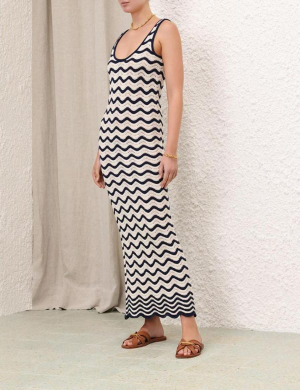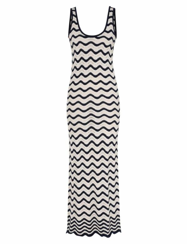 The Junie Textured Knit Dress in Navy/Cream from our Resort Swim 2024 Collection. A knitted midi dress featuring a scoop neckline.