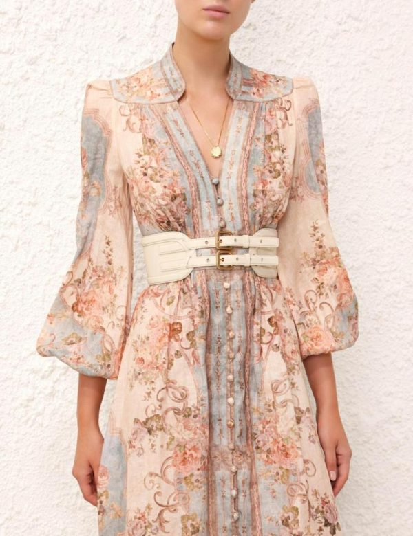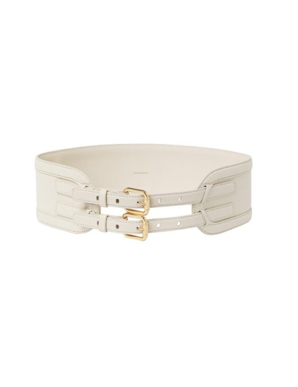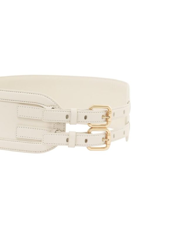 The Leather Belt 90 in Macadamia from our Resort 2024 Collection, Matchmaker. A wide leather belt featuring a double buckle and topstitching throughout.