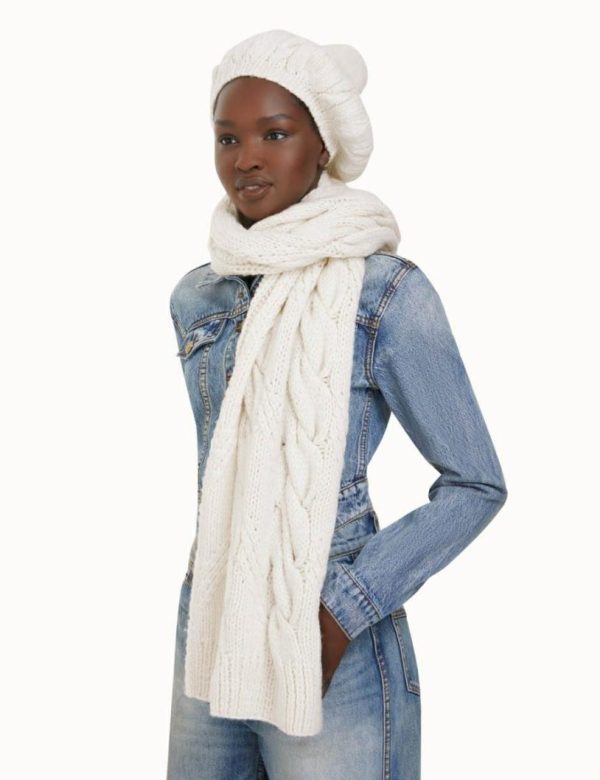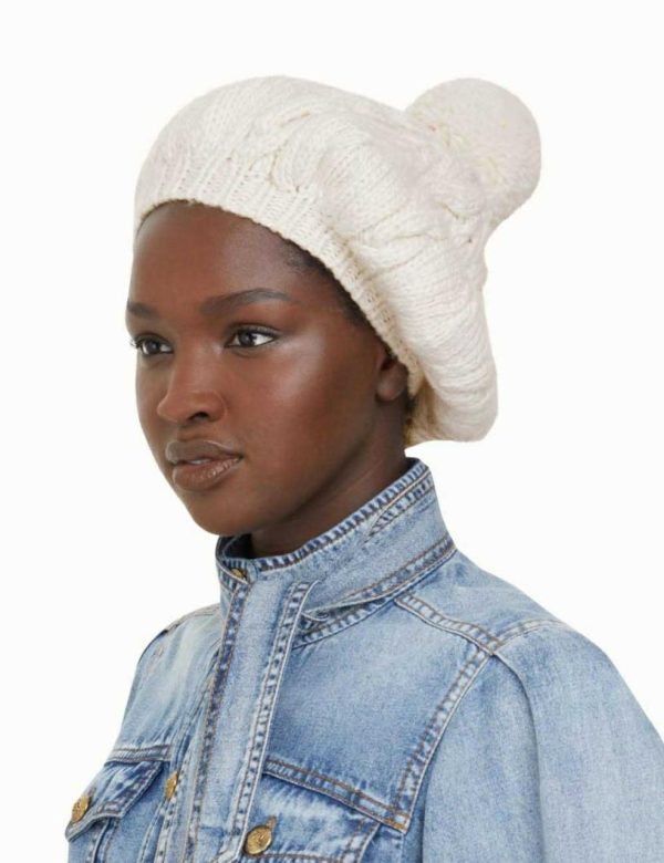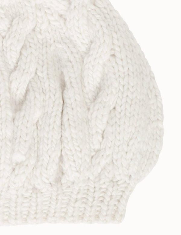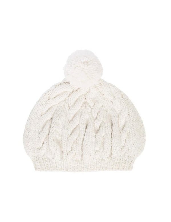 The Luminosity Cable Beanie in Cream from our Fall 2023 Collection, Luminosity. A wool beanie featuring a cable knit throughout and pompom detail.