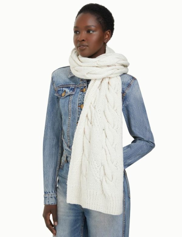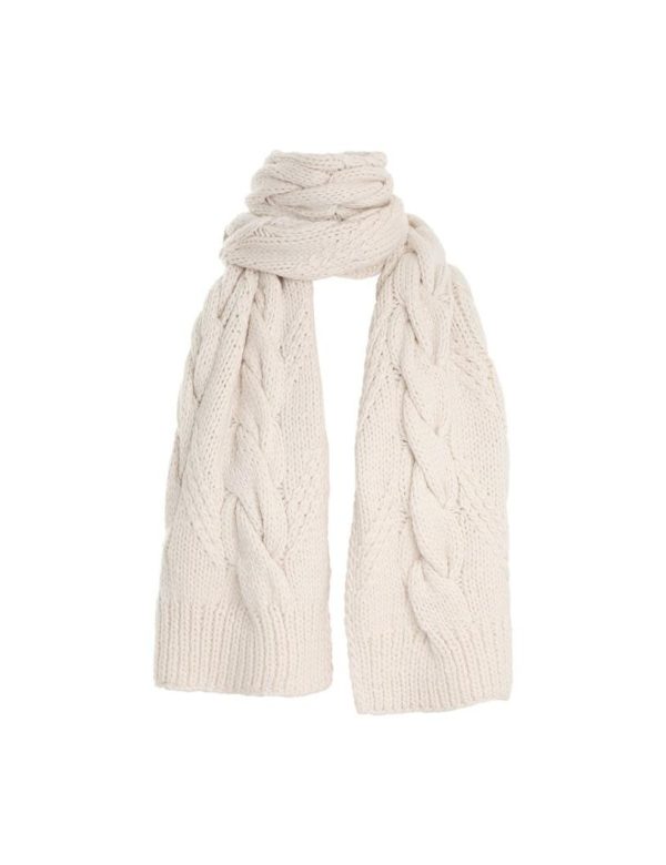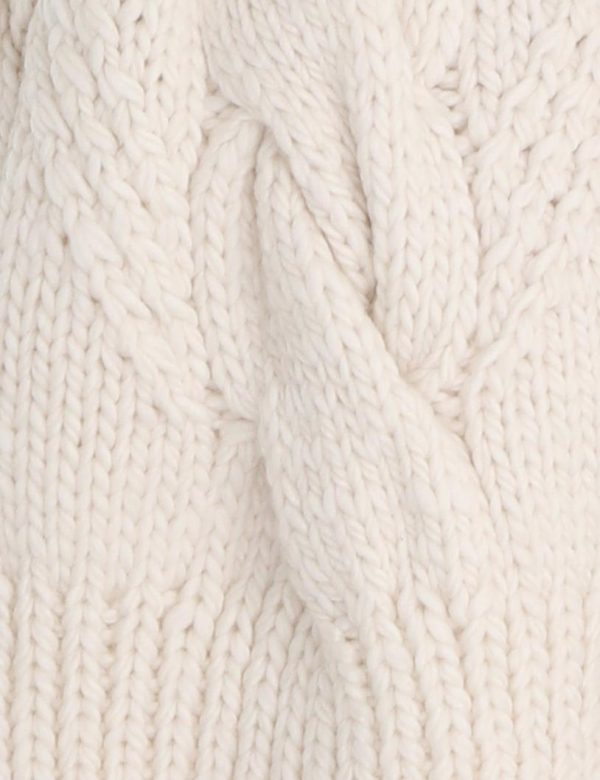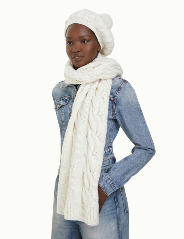 The Luminosity Cable Beanie in Cream from our Fall 2023 Collection, Luminosity. A hand knitted scarf featuring a cable stitch throughout.