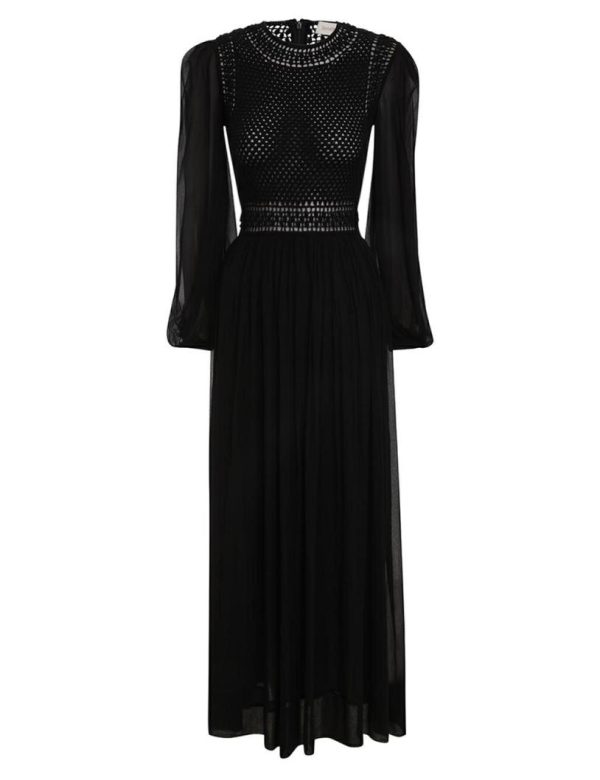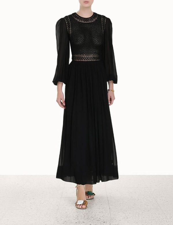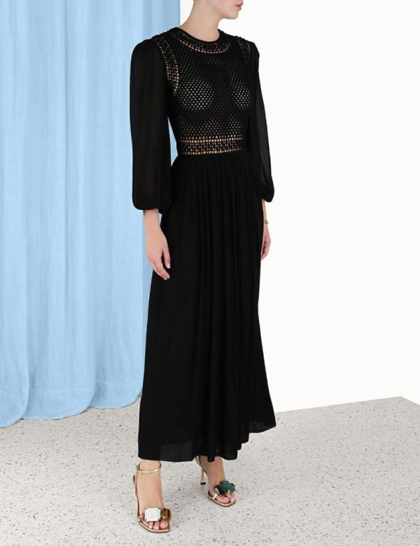 The Luminosity Crochet Bodice Midi in Black from our Fall 2023 Collection, Luminosity. A long sleeve midi dress featuring a crochet bodice and blouson sleeves with elasticated sleeve cuffs.
