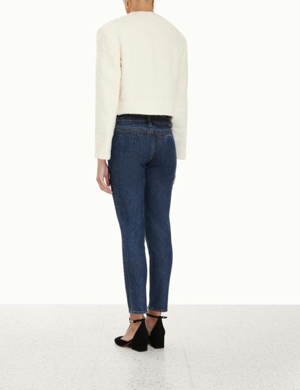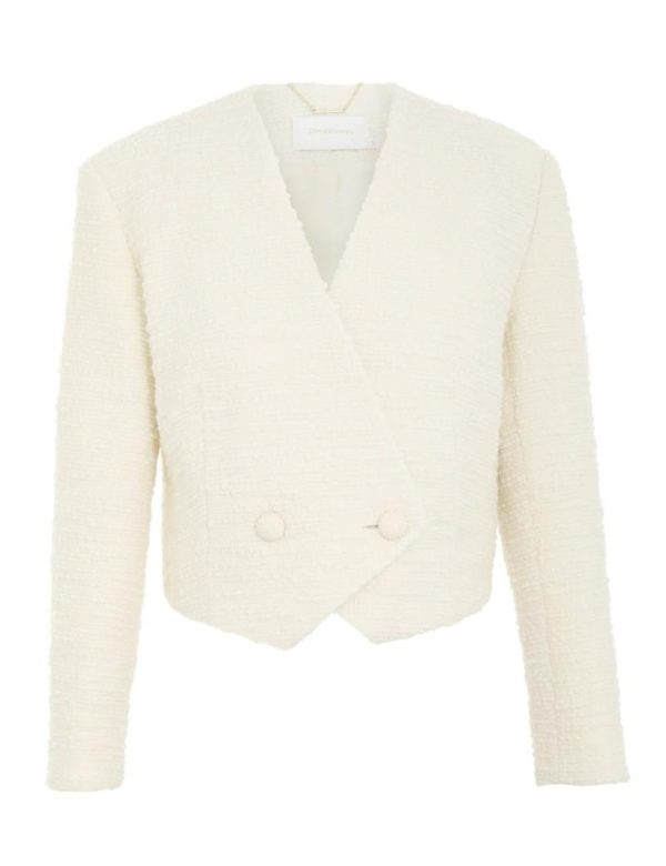 The Luminosity Cropped Blazer in Cream from our Fall 2023 Collection, Luminosity. A boucle wool blend jacket featuring a double breasted closure and cropped silhouette.