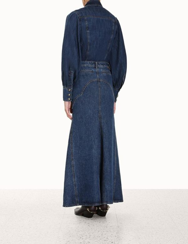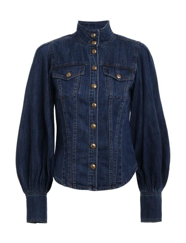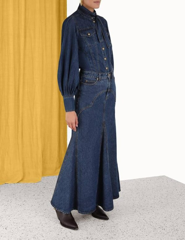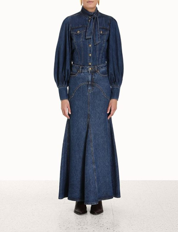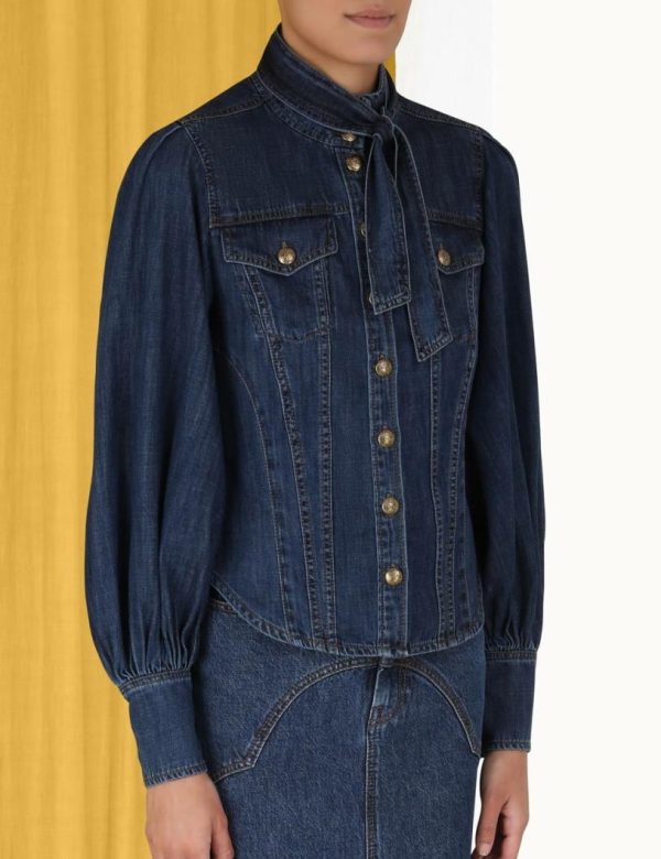 The Luminosity Denim Corset Shirt in Sapphire from our Fall 2023 Collection, Luminosity. A denim shirt featuring lantern sleeves and custom branded buttons, finished with a neck tie.
