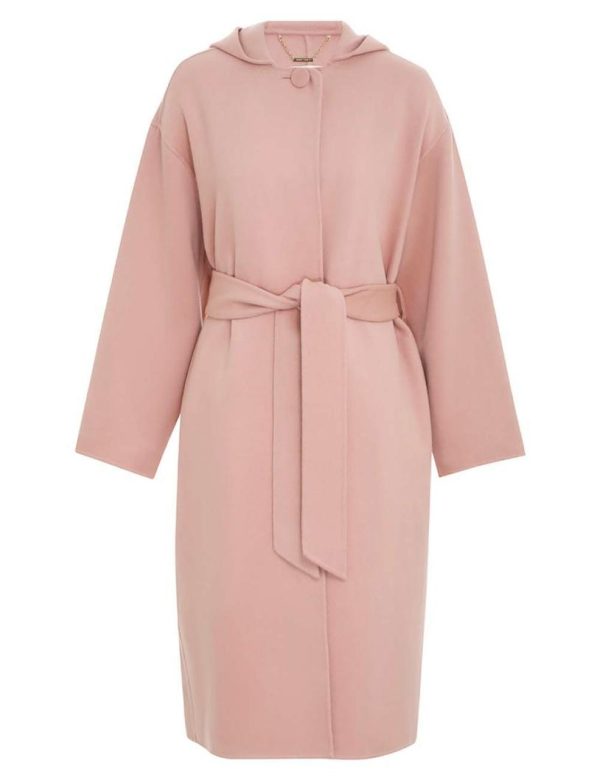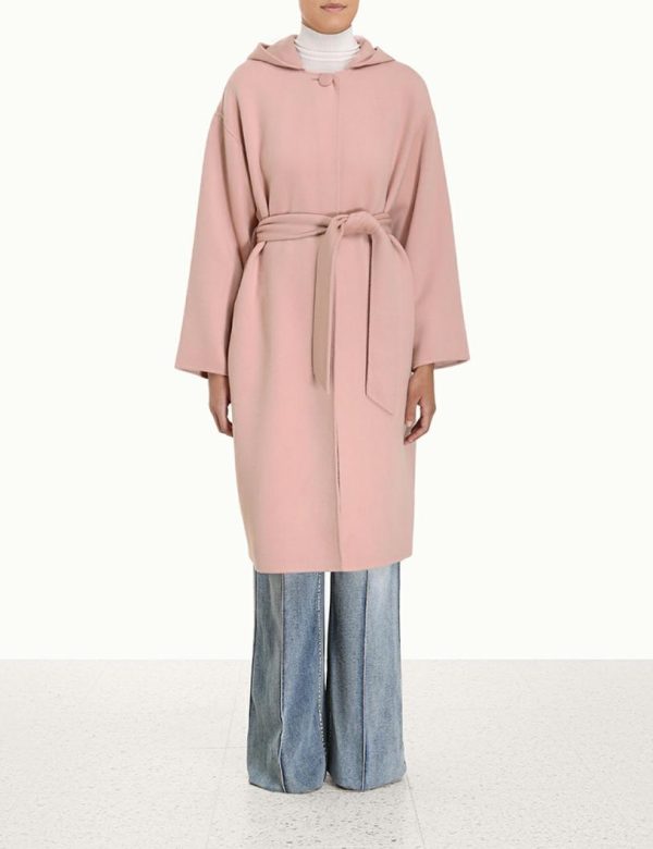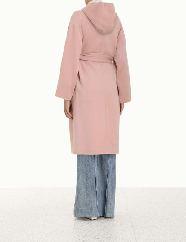 The Luminosity Felted Hooded Coat in Dusty Pink from our Fall 2023 Collection, Luminosity. A wrap style wool coat featuring a hood and in seam pockets.