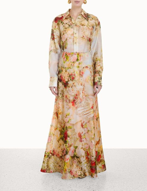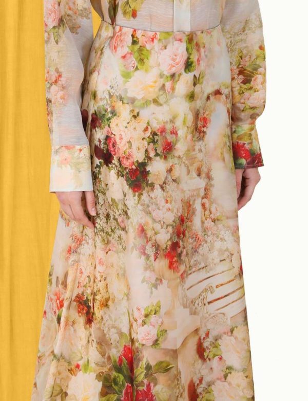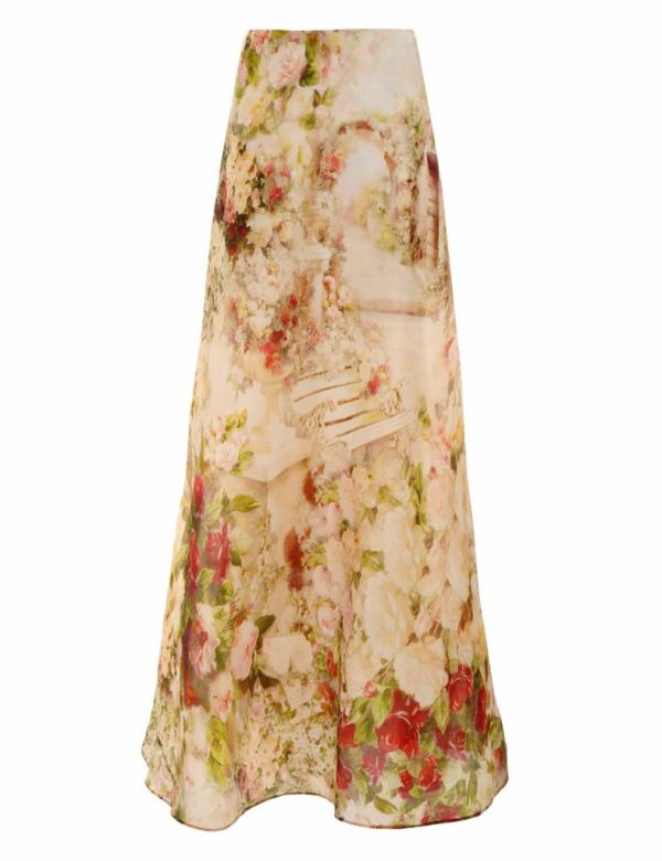 The Luminosity Flare Skirt in Rosy Garden Floral from our Fall 2023 Collection, Luminosity. A silk satin organza skirt featuring a bias cut and elastic waist.