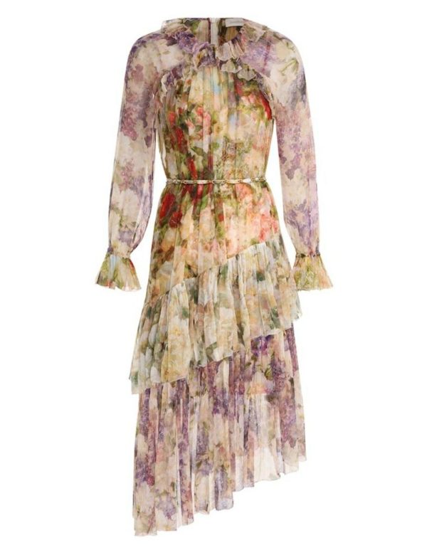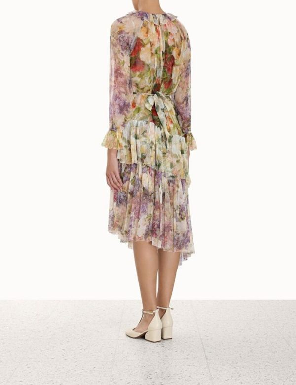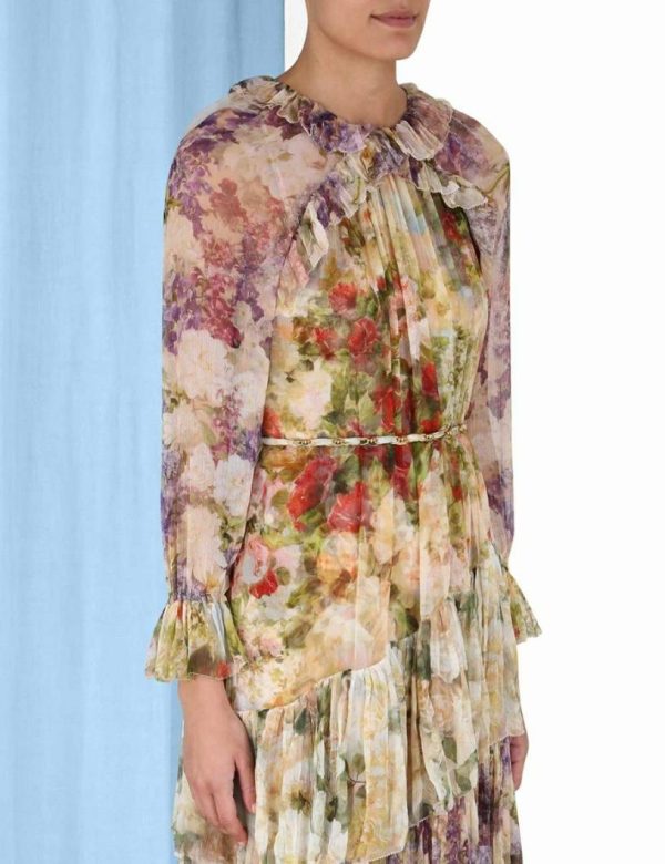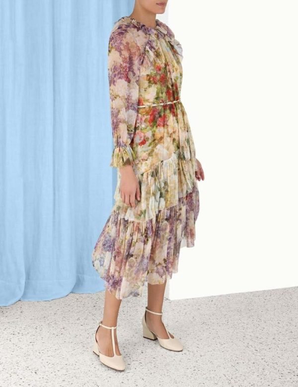 The Luminosity Frill Midi Dress in Multi Spliced Floral from our Fall 2023 Collection, Luminosity. A silk georgette midi dress featuring frills throughout, picot edge trims, and raglan sleeves with elasticated cuffs.