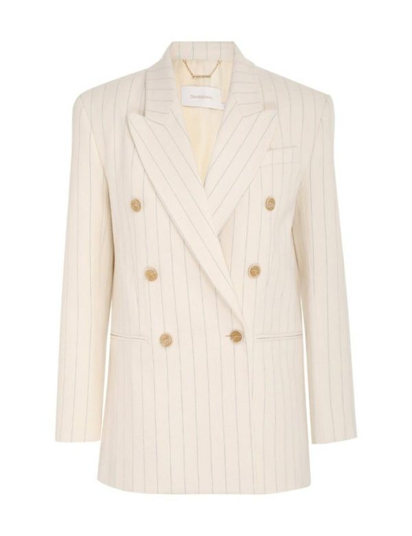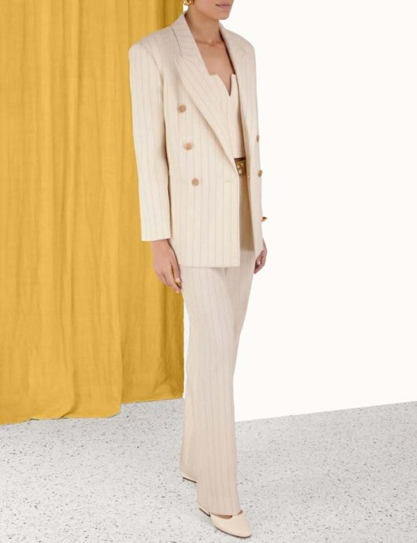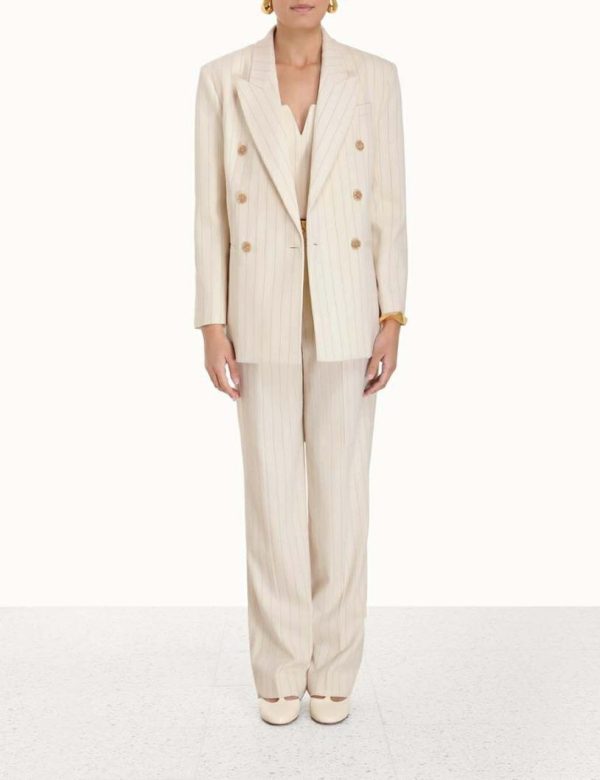The Luminosity Relaxed Jacket in Cream Stripe from our Fall 2023 Collection, Luminosity. A wool blend, longline jacket featuring shoulder pads and a double breasted closure.