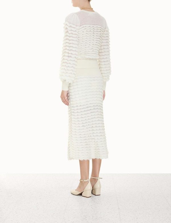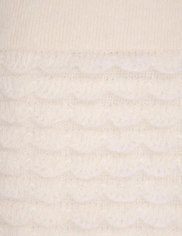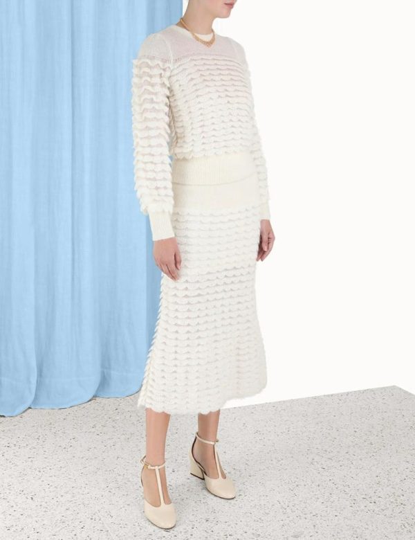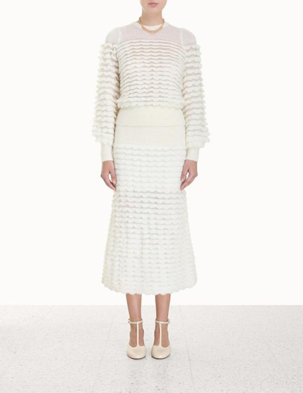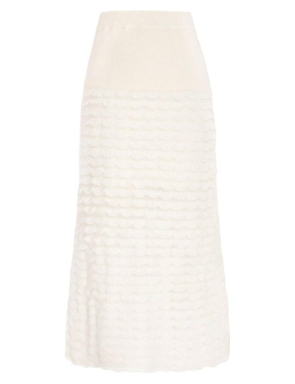 The Luminosity Scallop Skirt in Cream from our Fall 2023 Collection, Luminosity. An alpaca wool blend skirt featuring an elastic waistband and scalloped frills throughout.