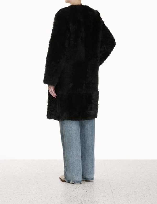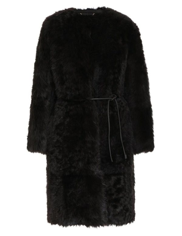 The Luminosity Shearling Coat in Chocolate from our Fall 2023 Collection, Luminosity. An oversized shearling coat featuring pockets throughout and a self tie tube belt .