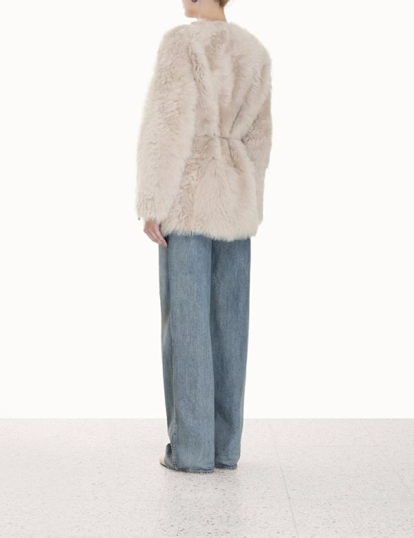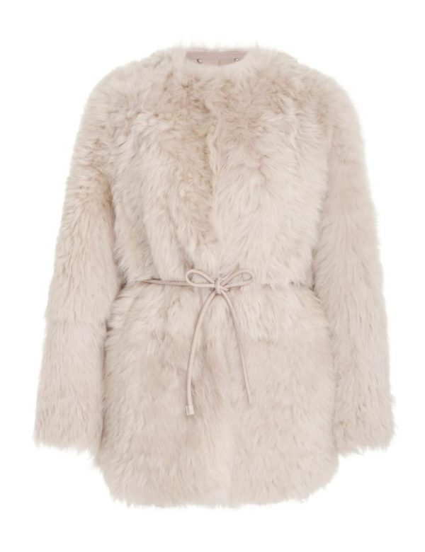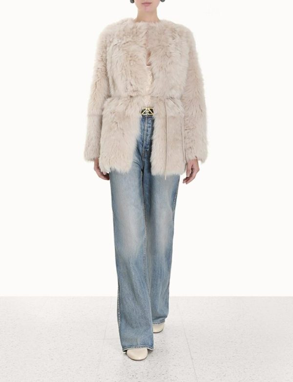 The Luminosity Shearling Jacket in Bone from our Fall 2023 Collection, Luminosity. An oversized shearling jacket featuring pockets throughout and a self tie tube belt .