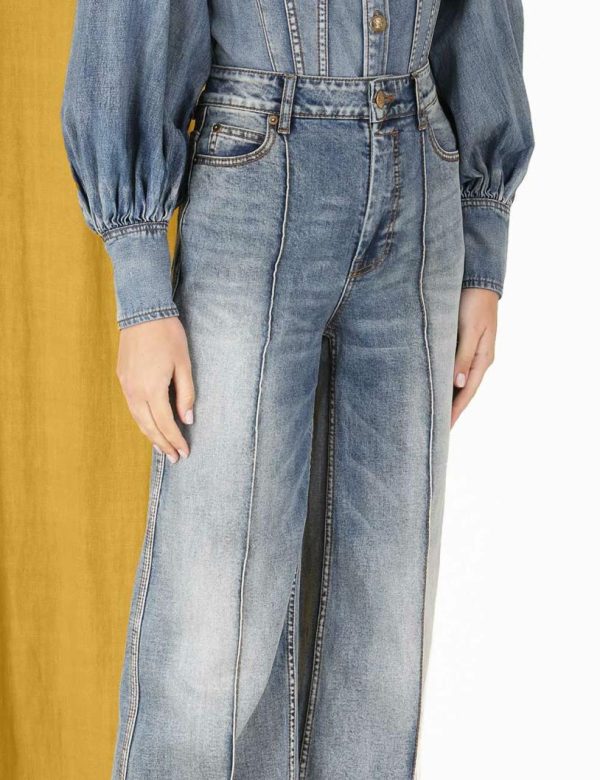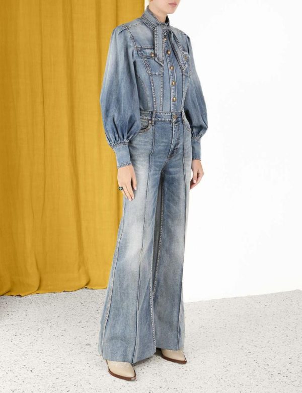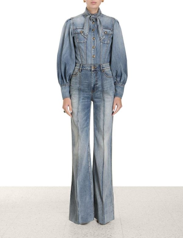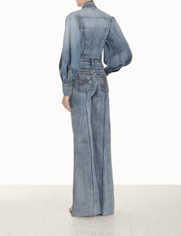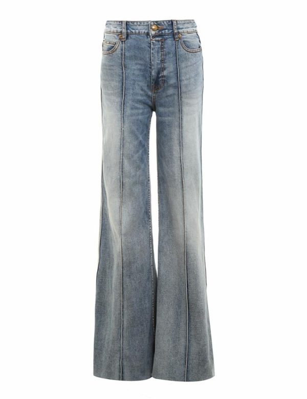 The Luminosity Wide Leg Jean in Briny Blue from our Fall 2023 Collection, Luminosity. A high waisted denim jean featuring a wide flared leg and pin stitched centre leg creases.