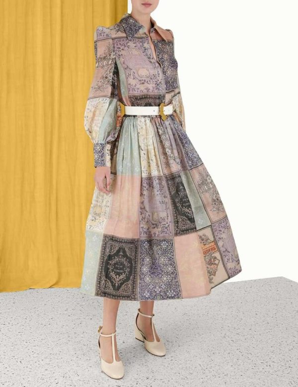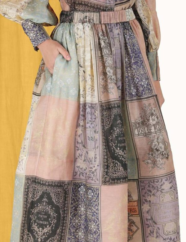 The Lyrical Book Print Midi Skirt in Book Cover Patch from our Fall 2023 Collection, Luminosity. A silk linen organza midi skirt featuring a patchwork book print and crinoline inserted at the hemline.