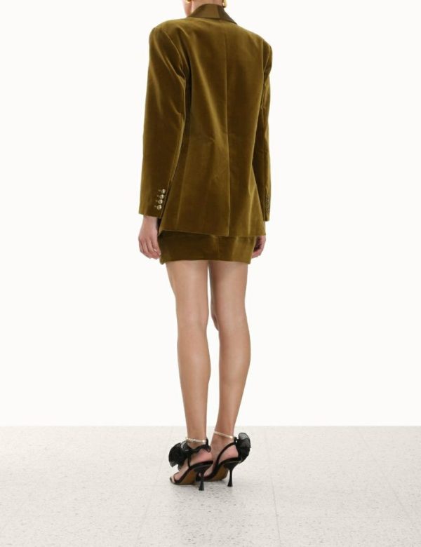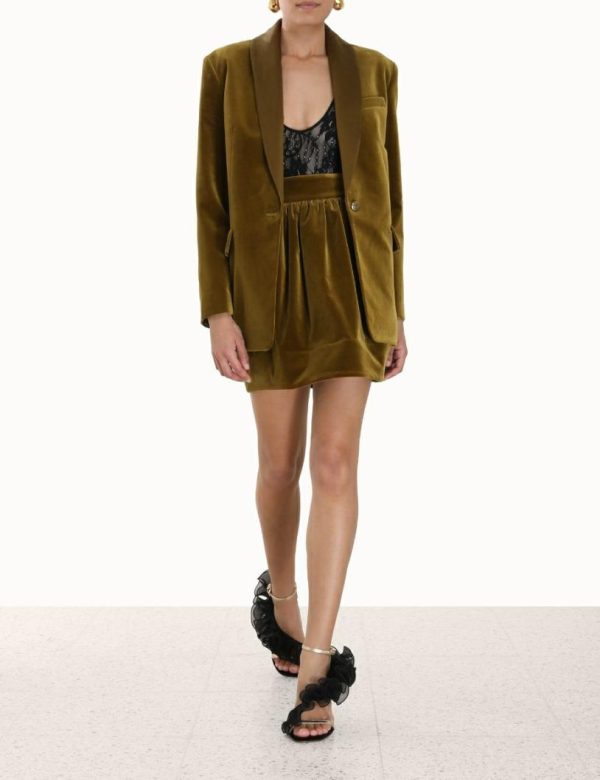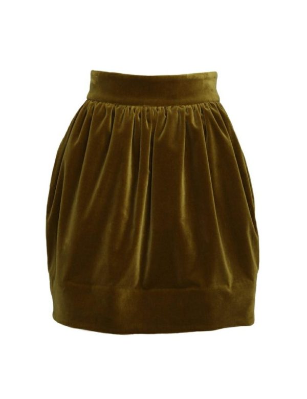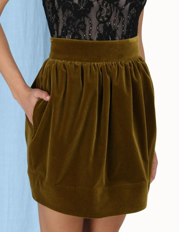 The Lyrical Velvet Mini Skirt in Chartreuse from our Fall 2023 Collection, Luminosity. A velvet mini skirt featuring gathering around the waistband and a side seam pocket.