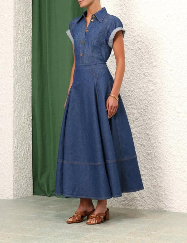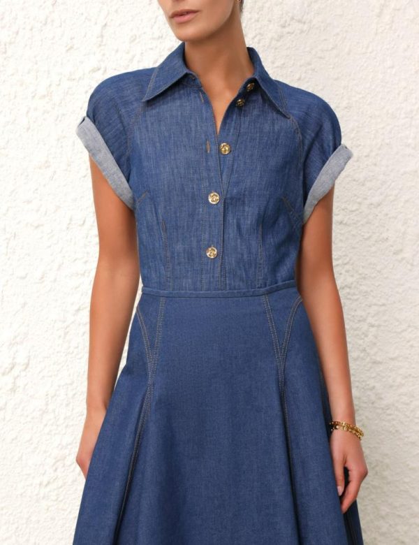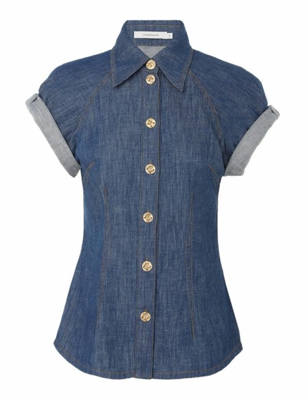 The Matchmaker Denim Blouse in Railway Blue from our Resort 2024 Collection, Matchmaker. A denim blouse featuring short cuffed sleeves and custom metal buttons.