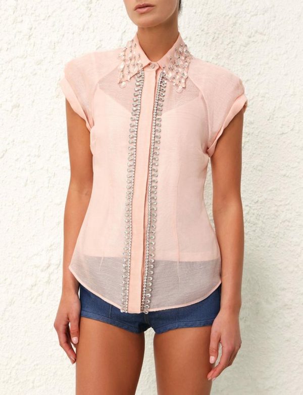 The Matchmaker Diamante Blouse in Pink from our Resort 2024 Collection, Matchmaker. A silk linen blouse featuring cuffed sleeves and crystal trims throughout.