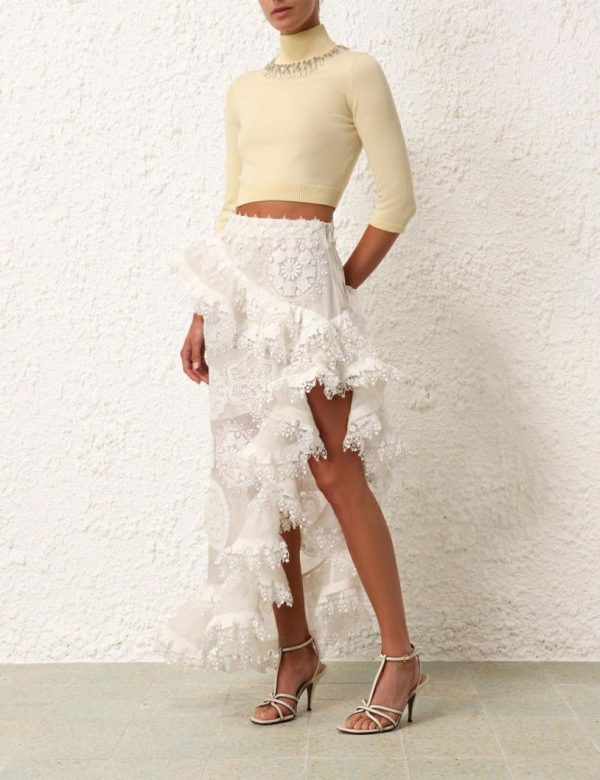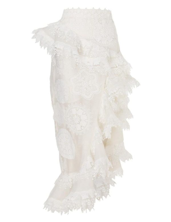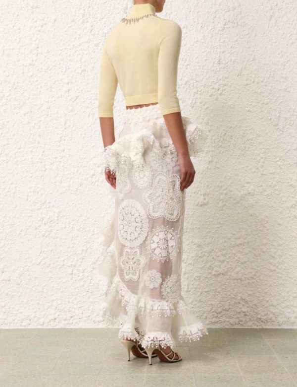 The Matchmaker Doily Skirt in Ivory from our Resort 2024 Collection, Matchmaker. A silk linen organza skirt featuring a waterfall ruffle and doily applique throughout.