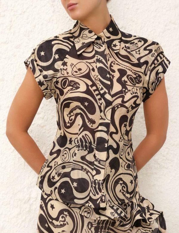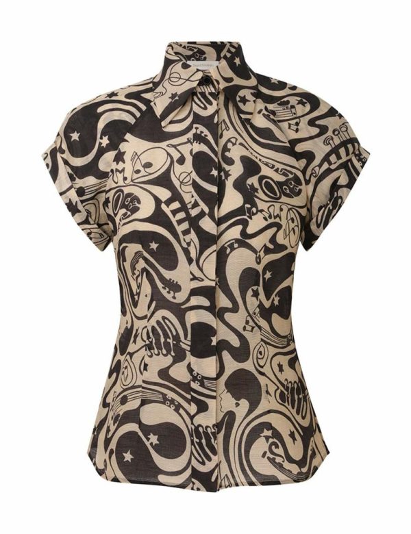 The Matchmaker Fitted Blouse in Black/Tea Abstract Musical from our Resort 2024 Collection, Matchmaker. A silk linen organza blouse featuring a concealed placket and rolled sleeves.