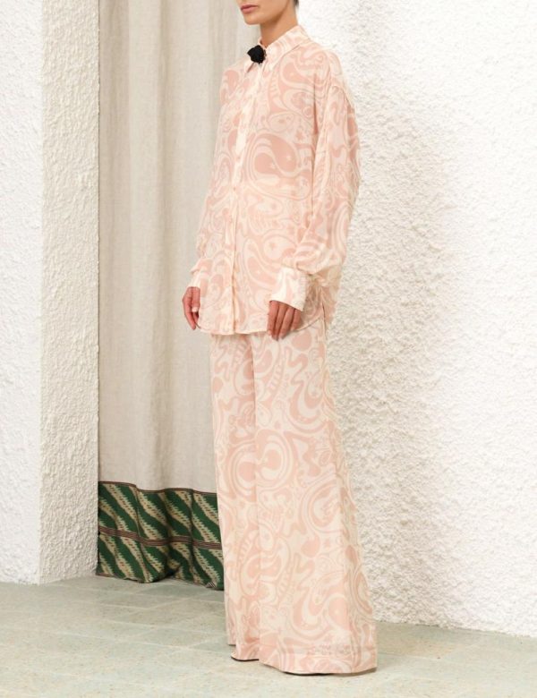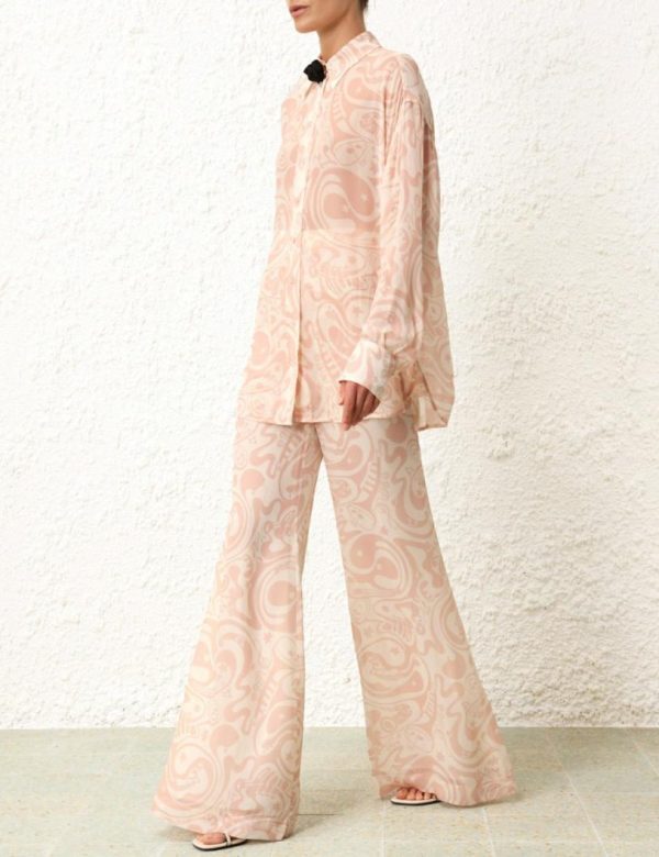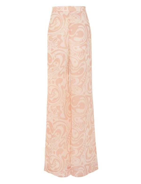 The Matchmaker Flare Pant in Pink/Cream Abstract Musical from our Resort 2024 Collection, Matchmaker. A high waisted, wide leg pant featuring a flared silhouette.