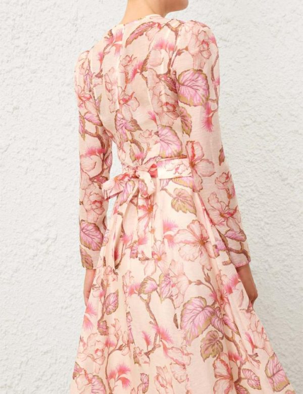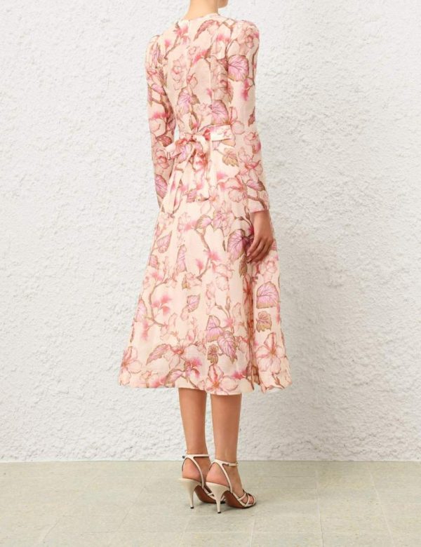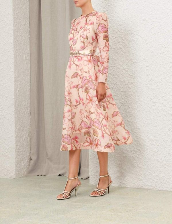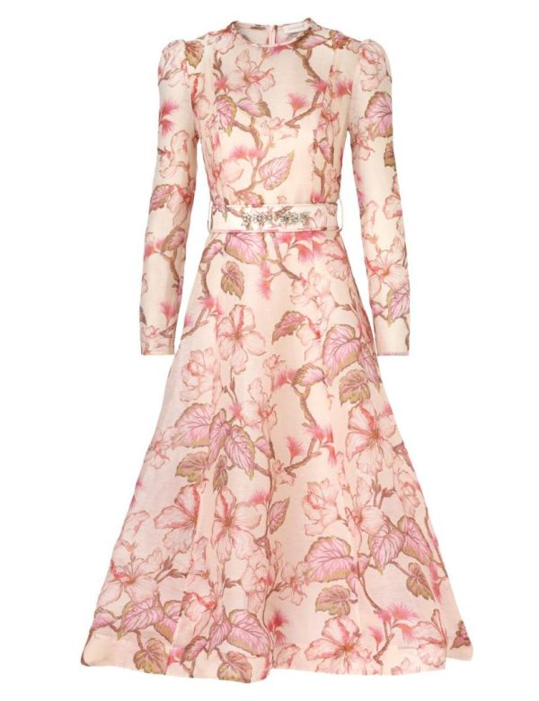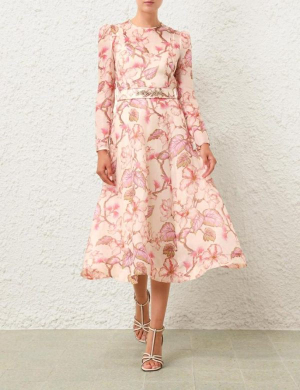 The Matchmaker Floral Midi Dress in Coral Hibiscus from our Resort 2024 Collection, Matchmaker. A silk linen organza midi dress featuring a fitted bodice and full skirt, finished with a diamante trimmed belt.