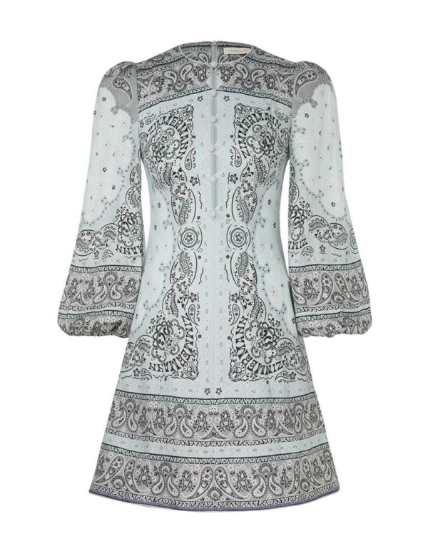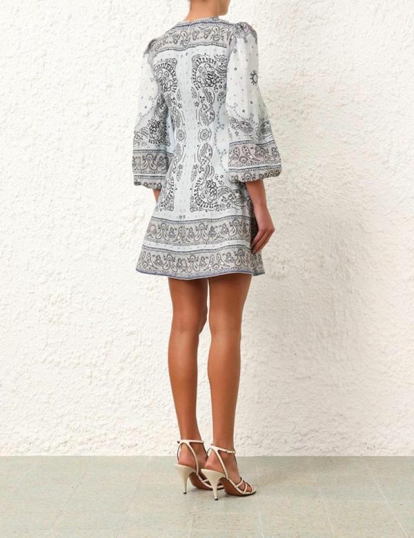 The Matchmaker Keyhole Mini Dress in Blue Bandana from our Resort 2024 Collection, Matchmaker. A long sleeve linen mini featuring a centre front keyhole detail and elasticated sleeve cuffs.