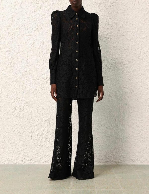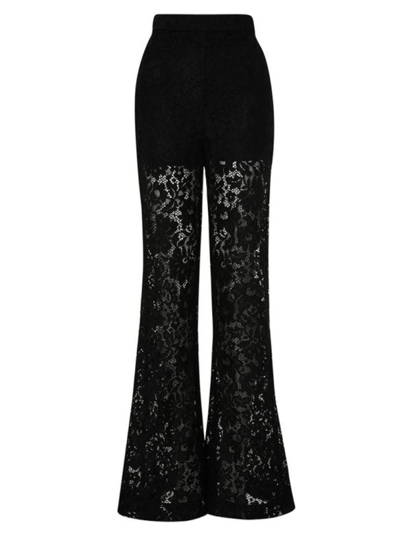 The Matchmaker Lace Pant in Black from our Resort 2024 Collection, Matchmaker. A lace wide leg pant featuring a flare silhouette and high rise waist.