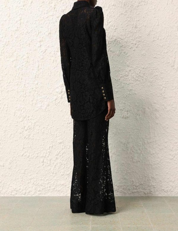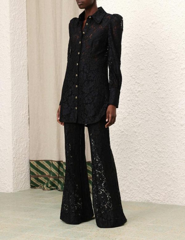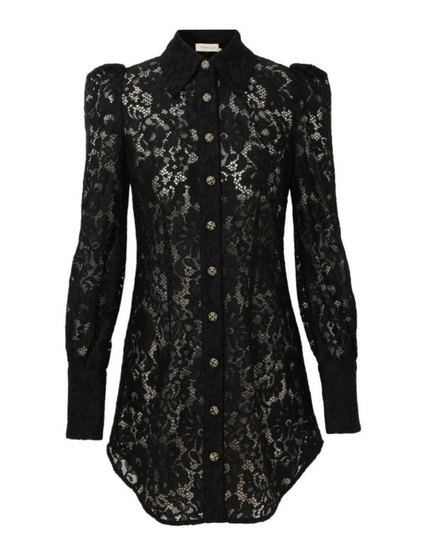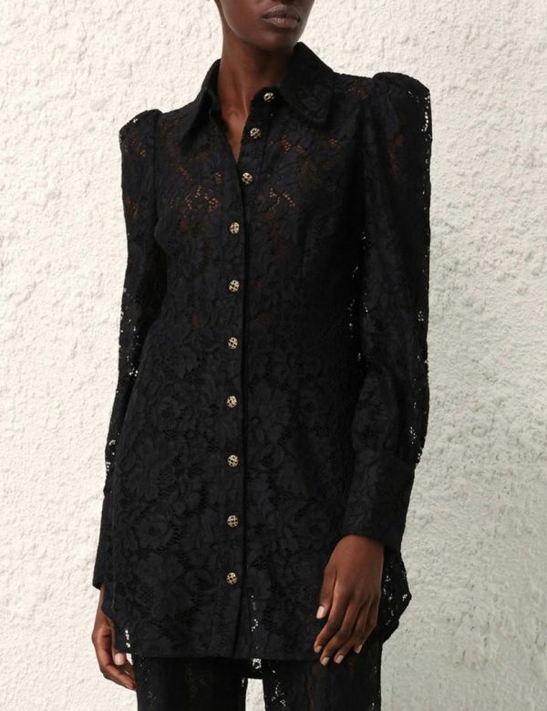 The Matchmaker Lace Tunic in Black from our Resort 2024 Collection, Matchmaker. A long sleeve lace tunic featuring a classic collar and buttons down the centre front.